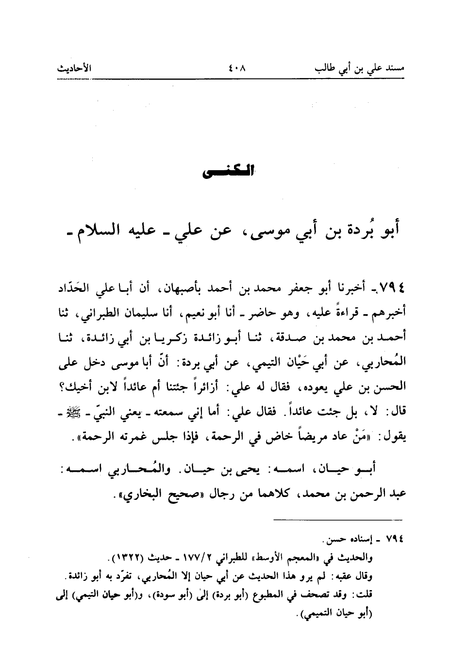 ٧٩٤ - أَخْبَرَنَا أَبُو جَعْفَرٍ مُحَمَّدُ بْنُ أَحْمَدَ - بِأَصْبَهَانَ - أَنَّ أَبَا عَلِيٍّ الْحَدَّادَ أَخْبَرَهُمْ - قِرَاءَةً عَلَيْهِ وَهُوَ حَاضِرٌ - أَنَا أَبُو نُعَيْمٍ، أَنَا سُلَيْمَانُ الطَّبَرَانِيُّ، ثَنَا أَحْمَدُ بْنُ مُحَمَّدِ بْنِ صَدَقَةَ، ثَنَا أَبُو زَائِدَةَ زَكَرِيَّا بْنُ أَبِي زَائِدَةَ، ثَنَا الْمُحَارِبِيُّ، عَنْ أَبِي حَيَّانَ التَّيْمِيِّ، عَنْ أَبِي بُرْدَةَ، «أَنَّ أَبَا مُوسَى دَخَلَ عَلَى الْحَسَنِ بْنِ عَلِيٍّ يَعُودُهُ، فَقَالَ لَهُ عَلِيٌّ: أَزَائِرًا جِئْتَنَا أَمْ عَائِدًا لِابْنِ أَخِيكَ؟ قَالَ: لَا بَلْ جِئْتُ عَائِدًا، فَقَالَ عَلِيٌّ: أَمَا إِنِّي سَمِعْتُهُ - يَعْنِي النَّبِيَّ صَلَّى اللهُ عَلَيْهِ وَسَلَّمَ - يَقُولُ: مَنْ عَادَ مَرِيضًا خَاضَ فِي الرَّحْمَةِ، فَإِذَا جَلَسَ غَمَرَتْهُ الرَّحْمَةُ».