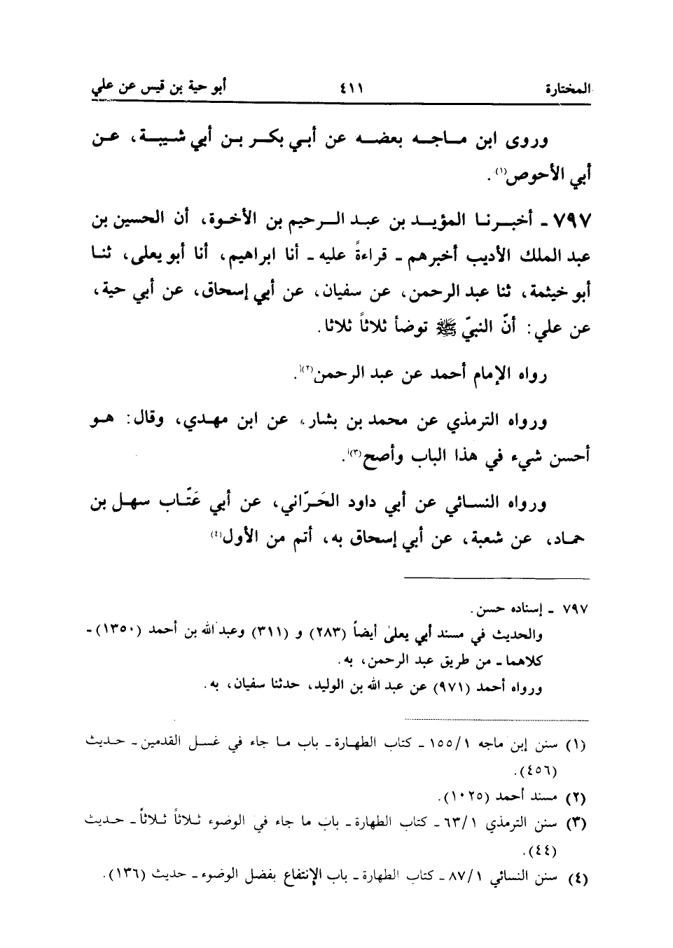 ٧٩٧ - أَخْبَرَنَا الْمُؤَيَّدُ بْنُ عَبْدِ الرَّحِيمِ بْنِ الْإِخْوَةِ أَنَّ الْحُسَيْنَ بْنَ عَبْدِ الْمَلِكِ الْأَدِيبَ أَخْبَرَهُمْ - قِرَاءَةً عَلَيْهِ - أَنَا إِبْرَاهِيمُ (¬١)، أَنَا أَبُو يَعْلَى، ثَنَا أَبُو خَيْثَمَةَ، ثَنَا عَبْدُ الرَّحْمَنِ، عَنْ سُفْيَانَ، عَنْ أَبِي إِسْحَاقَ، عَنْ أَبِي حَيَّةَ، عَنْ عَلِيٍّ: «أَنَّ النَّبِيَّ -صَلَّى اللهُ عَلَيْهِ وَسَلَّمَ - تَوَضَّأَ ثَلَاثًا ثَلَاثًا».