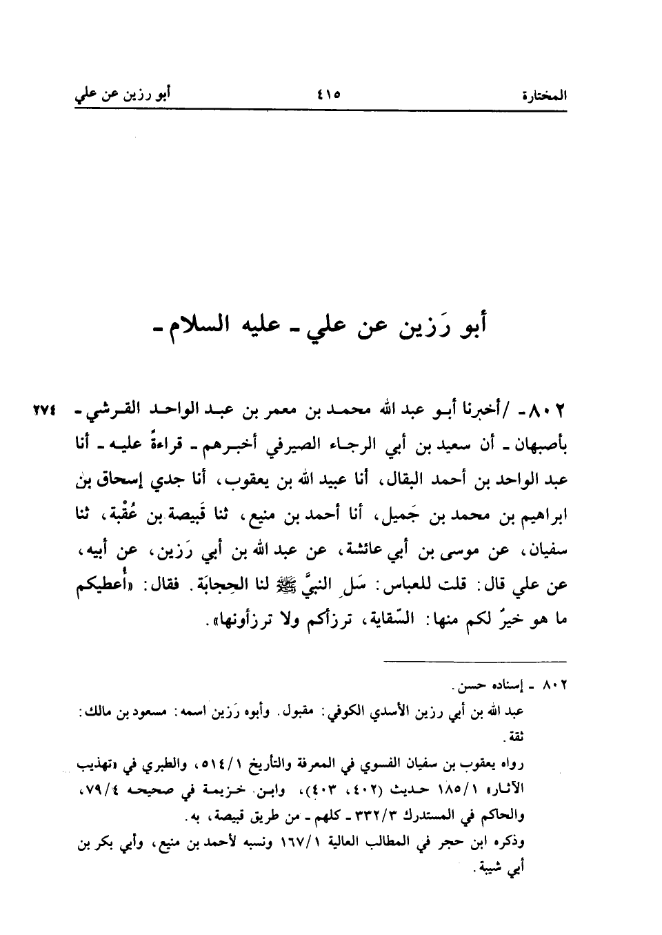 ٨٠٢ - أَخْبَرَنَا أَبُو عَبْدِ اللهِ مُحَمَّدُ بْنُ مَعْمَرِ بْنِ عَبْدِ الْوَاحِدِ الْقُرَشِيُّ - بِأَصْبَهَانَ - أَنَّ سَعِيدَ بْنَ أَبِي الرَّجَاءِ الصَّيْرَفِيَّ أَخْبَرَهُمْ - قِرَاءَةً عَلَيْهِ - أَنَا عَبْدُ الْوَاحِدِ بْنُ أَحْمَدَ الْبَقَّالُ، أَنَا عُبَيْدُ اللهِ بْنُ يَعْقُوبَ، أَنَا جَدِّي إِسْحَاقُ بْنُ إِبْرَاهِيمَ بْنِ مُحَمَّدِ بْنِ جَمِيلٍ، أَنَا أَحْمَدُ بْنُ مَنِيعٍ، ثَنَا قَبِيصَةُ بْنُ عُقْبَةَ، ثَنَا سُفْيَانُ، عَنْ مُوسَى بْنِ أَبِي عَائِشَةَ، عَنْ عَبْدِ اللهِ بْنِ أَبِي رَزِينٍ، عَنْ أَبِيهِ، عَنْ عَلِيٍّ قَالَ: «قُلْتُ لِلْعَبَّاسِ: سَلِ النَّبِيَّ -صَلَّى اللهُ عَلَيْهِ وَسَلَّمَ - لَنَا الْحِجَابَةَ، فَقَالَ: أُعْطِيكُمْ مَا هُوَ خَيْرٌ لَكُمْ مِنْهَا، السِّقَايَةُ، تَرْزَؤُكُمْ وَلَا تَرْزَءُونَهَا».