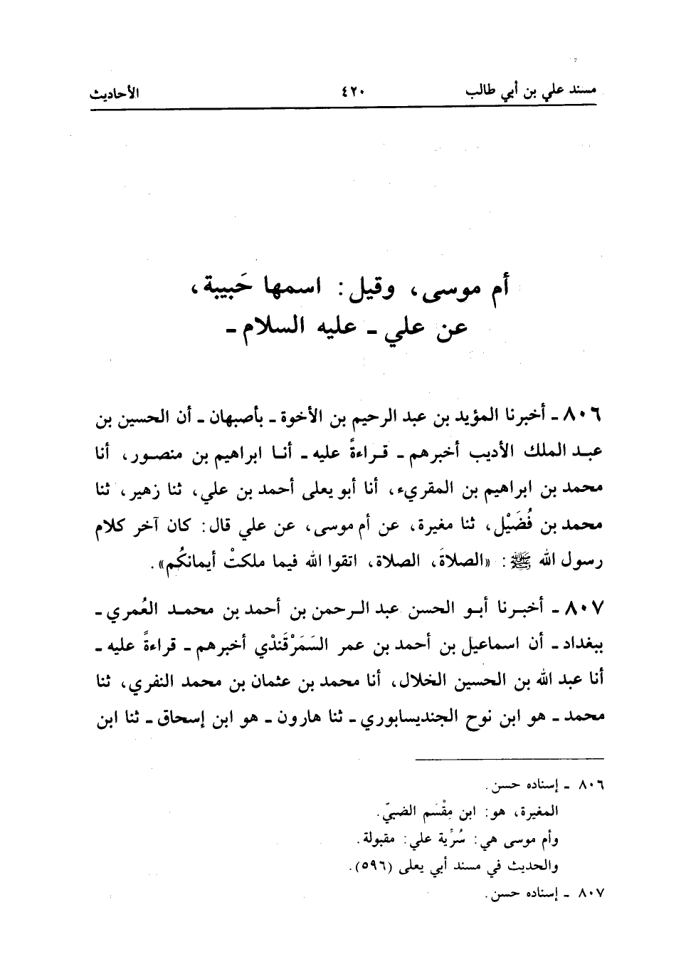 ٨٠٦ - أَخْبَرَنَا الْمُؤَيَّدُ بْنُ عَبْدِ الرَّحِيمِ بْنِ الْإِخْوَةِ - بِأَصْبَهَانَ - أَنَّ الْحُسَيْنَ بْنَ عَبْدِ الْمَلِكِ الْأَدِيبَ أَخْبَرَهُمْ - قِرَاءَةً عَلَيْهِ - أَنَا إِبْرَاهِيمُ بْنُ مَنْصُورٍ، أَنَا مُحَمَّدُ بْنُ إِبْرَاهِيمَ بْنِ الْمُقْرِئِ، أَنَا أَبُو يَعْلَى أَحْمَدُ بْنُ عَلِيٍّ، ثَنَا زُهَيْرٌ، ثَنَا مُحَمَّدُ بْنُ فُضَيْلٍ، ثَنَا مُغِيرَةُ، عَنْ أُمِّ مُوسَى، عَنْ عَلِيٍّ قَالَ: «كَانَ آخِرُ كَلَامِ رَسُولِ اللهِ -صَلَّى اللهُ عَلَيْهِ وَسَلَّمَ -: الصَّلَاةَ الصَّلَاةَ، اتَّقُوا اللهَ فِيمَا مَلَكَتْ أَيْمَانُكُمْ».
