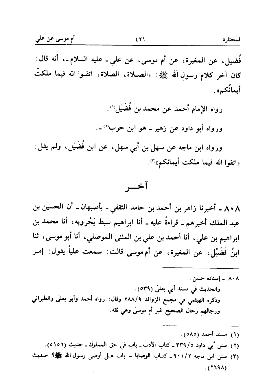 ٨٠٨ - أَخْبَرَنَا زَاهِرُ بْنُ أَحْمَدَ بْنِ حَامِدٍ الثَّقَفِيُّ - بِأَصْبَهَانَ - أَنَّ الْحُسَيْنَ بْنَ عَبْدِ الْمَلِكِ أَخْبَرَهُمْ - قِرَاءَةً عَلَيْهِ - أَنَا إِبْرَاهِيمُ سِبْطُ بَحْرَوَيْهِ، أَنَا مُحَمَّدُ بْنُ إِبْرَاهِيمَ بْنِ عَلِيٍّ، أَنَا أَحْمَدُ بْنُ عَلِيِّ بْنِ الْمُثَنَّى الْمَوْصِلِيُّ، أَنَا أَبُو مُوسَى، ثَنَا ابْنُ فُضَيْلٍ، عَنِ الْمُغِيرَةِ، عَنْ أُمِّ مُوسَى، قَالَتْ: سَمِعْتُ عَلِيًّا يَقُولُ: «أَمَرَ
