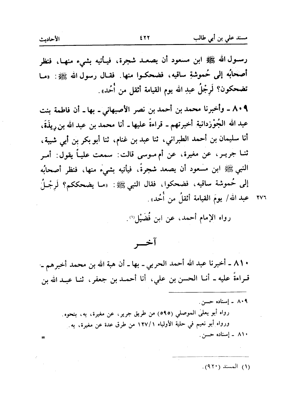 ٨٠٩ - وَأَخْبَرَنَا مُحَمَّدُ بْنُ أَحْمَدَ بْنِ نَصْرٍ الْأَصْبَهَانِيُّ بِهَا، أَنَّ فَاطِمَةَ بِنْتَ عَبْدِ اللهِ الْجُوزْدَانِيَّةَ، أَخْبَرَتْهُمْ - قِرَاءَةً عَلَيْهَا - أَنَا مُحَمَّدُ بْنُ عَبْدِ اللهِ بْنِ رِيذَةَ، أَنَا سُلَيْمَانُ بْنُ أَحْمَدَ الطَّبَرَانِيُّ، ثَنَا عَبْدُ بْنُ غَنَّامٍ، ثَنَا أَبُو بَكْرِ بْنُ أَبِي شَيْبَةَ، ثَنَا جَرِيرٌ، عَنْ مُغِيرَةَ، عَنْ أُمِّ مُوسَى قَالَتْ: سَمِعْتُ عَلِيًّا يَقُولُ: «أَمَرَ النَّبِيُّ - صَلَّى اللهُ عَلَيْهِ وَسَلَّمَ - ابْنَ مَسْعُودٍ أَنْ يَصْعَدَ شَجَرَةً، فَيَأْتِيَهُ بِشَيْءٍ مِنْهَا، فَنَظَرَ أَصْحَابُهُ إِلَى حُمُوشَةِ سَاقَيْهِ فَضَحِكُوا، فَقَالَ النَّبِيُّ صَلَّى اللهُ عَلَيْهِ وَسَلَّمَ: مَا يُضْحِكُكُمْ؟ لَرِجْلُ عَبْدِ اللهِ يَوْمَ الْقِيَامَةِ أَثْقَلُ مِنْ أُحُدٍ».