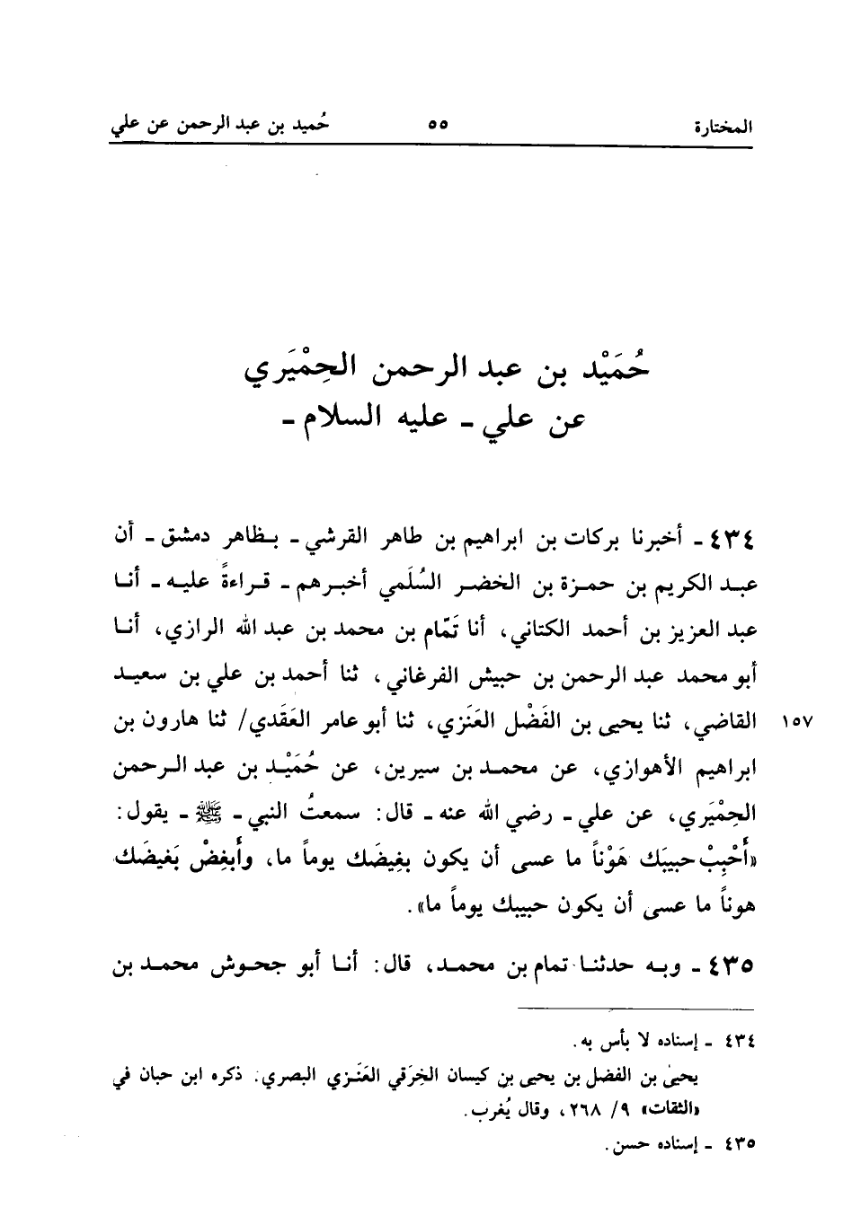 ٤٣٤ - أَخْبَرَنَا بَرَكَاتُ بْنُ إِبْرَاهِيمَ بْنِ طَاهِرٍ الْقُرَشِيُّ - بِظَاهِرِ دِمَشْقَ - أَنَّ عَبْدَ الْكَرِيمِ بْنَ حَمْزَةَ بْنِ الْخَضِرِ السُّلَمِيَّ أَخْبَرَهُمْ - قِرَاءَةً عَلَيْهِ - أَنَا عَبْدُ الْعَزِيزِ بْنُ أَحْمَدَ الْكَتَّانِيُّ، أَنَا تَمَّامُ بْنُ مُحَمَّدِ بْنِ عَبْدِ اللهِ الرَّازِيُّ، أَنَا أَبُو مُحَمَّدٍ عَبْدُ الرَّحْمَنِ بْنُ حُبَيْشٍ الْفَرْغَانِيُّ، ثَنَا أَحْمَدُ بْنُ عَلِيِّ بْنِ سَعِيدٍ الْقَاضِي، ثَنَا يَحْيَى بْنُ الْفَضْلِ الْعَنَزِيُّ، ثَنَا أَبُو عَامِرٍ الْعَقَدِيُّ، ثَنَا هَارُونُ بْنُ إِبْرَاهِيمَ الْأَهْوَازِيُّ، عَنْ مُحَمَّدِ بْنِ سِيرِينَ، عَنْ حُمَيْدِ بْنِ عَبْدِ الرَّحْمَنِ الْحِمْيَرِيِّ، عَنْ عَلِيٍّ - رَضِيَ اللهُ عَنْهُ - قَالَ: سَمِعْتُ النَّبِيَّ -صَلَّى اللهُ عَلَيْهِ وَسَلَّمَ - يَقُولُ: «أَحْبِبْ حَبِيبَكَ هَوْنًا مَا، عَسَى أَنْ يَكُونَ بَغِيضَكَ يَوْمًا مَا، وَأَبْغِضْ بَغِيضَكَ هَوْنًا مَا، عَسَى أَنْ يَكُونَ حَبِيبَكَ يَوْمًا مَا».