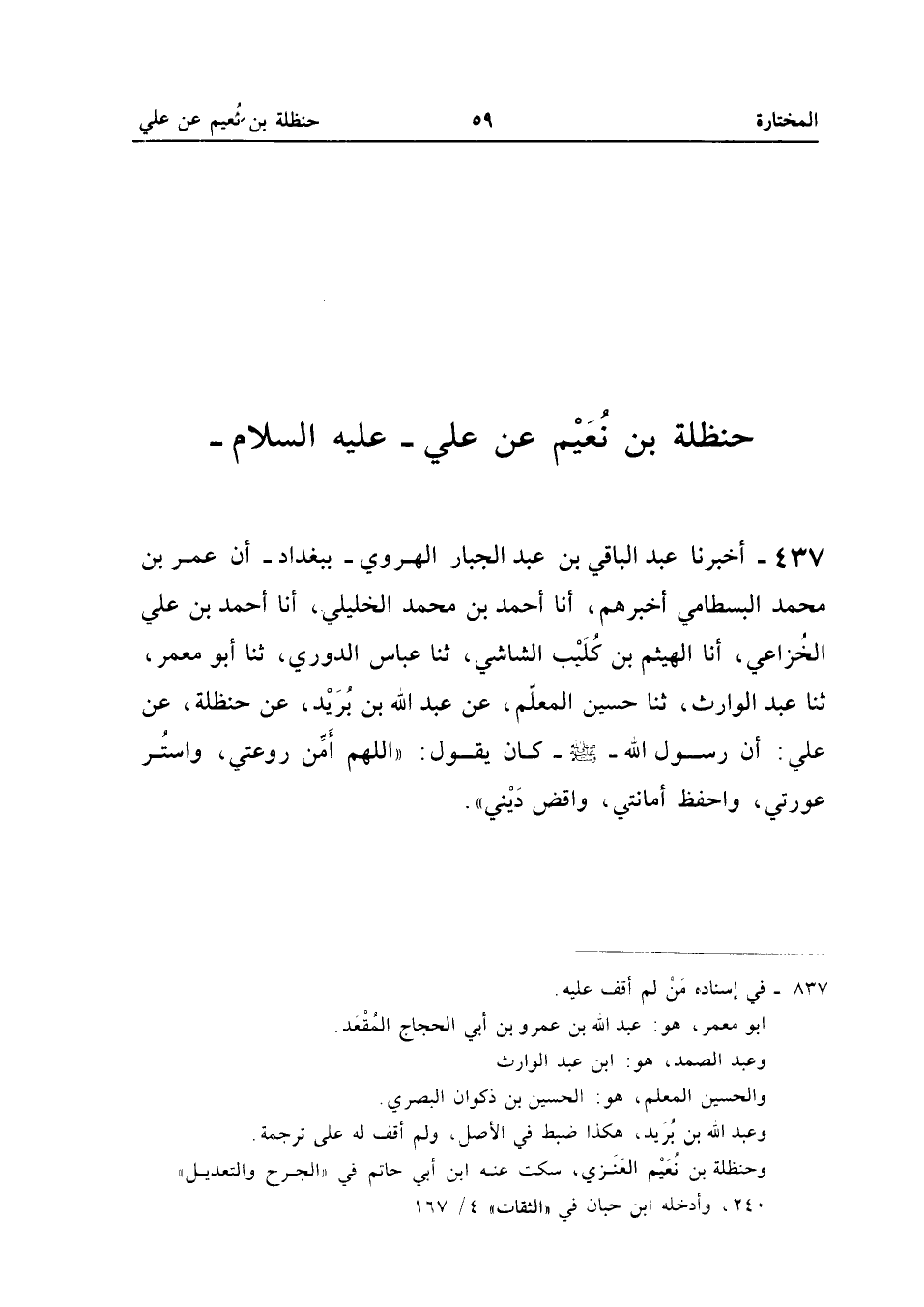 ٤٣٧ - أَخْبَرَنَا عَبْدُ الْبَاقِي بْنُ عَبْدِ الْجَبَّارِ الْهَرَوِيُّ - بِبَغْدَادَ - أَنَّ عُمَرَ بْنَ مُحَمَّدٍ الْبِسْطَامِيَّ أَخْبَرَهُمْ، أَنَا أَحْمَدُ بْنُ مُحَمَّدٍ الْخَلِيلِيُّ، أَنَا أَحْمَدُ بْنُ عَلِيٍّ الْخُزَاعِيُّ، أَنَا الْهَيْثَمُ بْنُ كُلَيْبٍ الشَّاشِيُّ، ثَنَا عَبَّاسٌ الدُّورِيُّ، ثَنَا أَبُو مَعْمَرٍ، ثَنَا عَبْدُ الْوَارِثِ، ثَنَا حُسَيْنُ الْمُعَلِّمُ، عَنْ عَبْدِ اللهِ بْنِ بُرَيْدٍ (¬١)، عَنْ حَنْظَلَةَ، عَنْ عَلِيٍّ أَنَّ رَسُولَ اللهِ -صَلَّى اللهُ عَلَيْهِ وَسَلَّمَ - كَانَ يَقُولُ: «اللَّهُمَّ أَمِّنْ رَوْعَتِي، وَاسْتُرْ عَوْرَتِي، وَاحْفَظْ أَمَانَتِي، وَاقْضِ دَيْنِي».