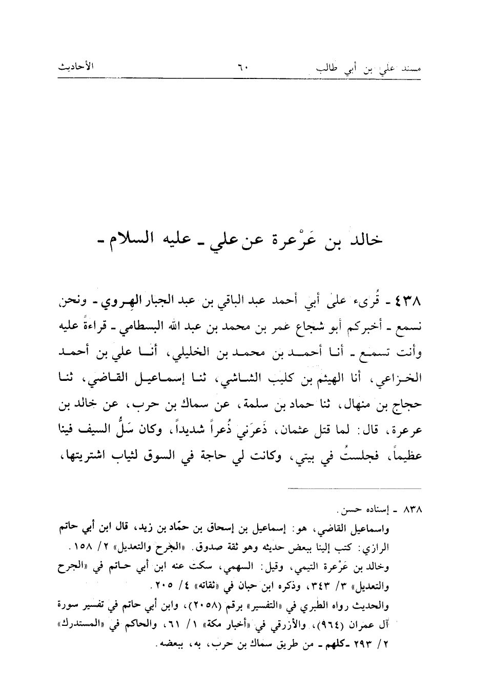 ٤٣٨ - قُرِئَ عَلَى أَبِي أَحْمَدَ عَبْدِ الْبَاقِي بْنِ عَبْدِ الْجَبَّارِ الْهَرَوِيِّ - وَنَحْنُ نَسْمَعُ - أَخْبَرَكُمْ أَبُو شُجَاعٍ عُمَرُ بْنُ مُحَمَّدِ بْنِ عَبْدِ اللهِ الْبِسْطَامِيُّ - قِرَاءَةً عَلَيْهِ وَأَنْتَ تَسْمَعُ - أَنَا أَحْمَدُ بْنُ مُحَمَّدِ بْنِ الْخَلِيلِيِّ، أَنَا عَلِيُّ بْنُ أَحْمَدَ الْخُزَاعِيُّ، أَنَا الْهَيْثَمُ بْنُ كُلَيْبٍ الشَّاشِيُّ، ثَنَا إِسْمَاعِيلُ الْقَاضِي، ثَنَا حَجَّاجُ بْنُ مِنْهَالٍ، ثَنَا حَمَّادُ بْنُ سَلَمَةَ، عَنْ سِمَاكِ بْنِ حَرْبٍ، عَنْ خَالِدِ بْنِ عَرْعَرَةَ قَالَ: «لَمَّا قُتِلَ عُثْمَانُ ذَعَرَنِي ذُعْرًا شَدِيدًا، وَكَانَ سَلُّ السَّيْفِ فِينَا عَظِيمًا، فَجَلَسْتُ فِي بَيْتِي، وَكَانَتْ لِي حَاجَةٌ فِي السُّوقِ لِثِيَابٍ اشْتَرَيْتُهَا