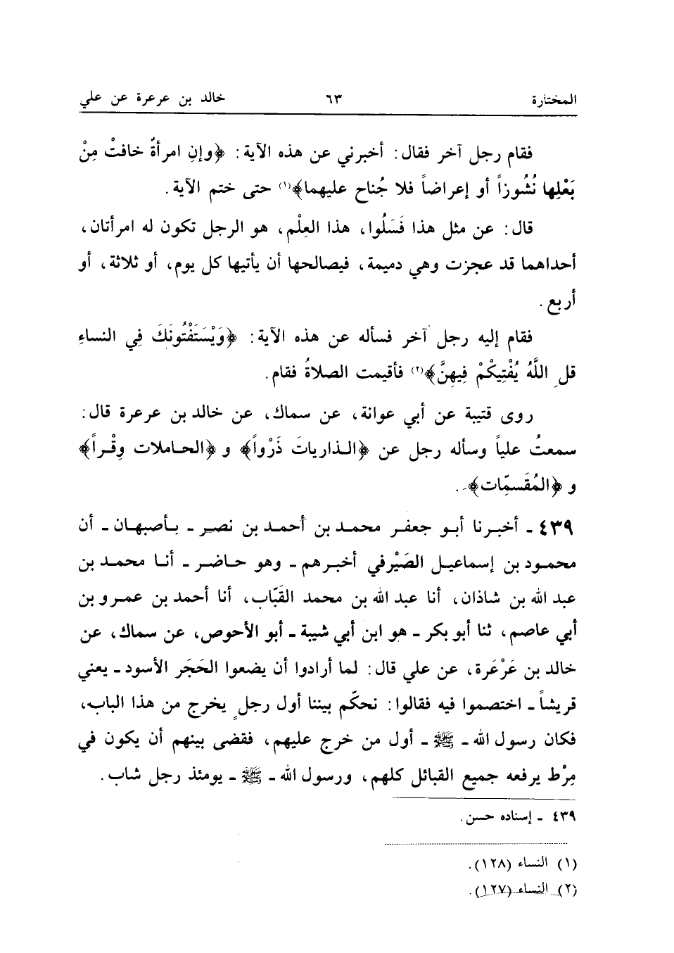 ٤٣٩ - أَخْبَرَنَا أَبُو جَعْفَرٍ مُحَمَّدُ بْنُ أَحْمَدَ بْنِ نَصْرٍ - بِأَصْبَهَانَ - أَنَّ مَحْمُودَ بْنَ إِسْمَاعِيلَ الصَّيْرَفِيَّ أَخْبَرَهُمْ - وَهُوَ حَاضِرٌ - أَنَا مُحَمَّدُ بْنُ عَبْدِ اللهِ بْنِ شَاذَانَ، أَنَا عَبْدُ اللهِ بْنُ مُحَمَّدٍ الْقَبَّابُ، أَنَا أَحْمَدُ بْنُ عَمْرِو بْنِ أَبِي عَاصِمٍ، ثَنَا أَبُو بَكْرٍ - هُوَ ابْنُ أَبِي شَيْبَةَ - ثَنَا أَبُو الْأَحْوَصِ، عَنْ سِمَاكٍ، عَنْ خَالِدِ بْنِ عَرْعَرَةَ، عَنْ عَلِيٍّ قَالَ: «لَمَّا أَرَادُوا أَنْ يَضَعُوا الْحَجَرَ الْأَسْوَدَ - يَعْنِي قُرَيْشًا - اخْتَصَمُوا فِيهِ، فَقَالُوا: نُحَكِّمُ بَيْنَنَا أَوَّلَ رَجُلٍ يَخْرُجُ مِنْ هَذِهِ الْبَابِ، فَكَانَ رَسُولُ اللهِ -صَلَّى اللهُ عَلَيْهِ وَسَلَّمَ - أَوَّلَ مَنْ خَرَجَ عَلَيْهِمْ، فَقَضَى بَيْنَهُمْ أَنْ يَكُونَ فِي مِرْطٍ يَرْفَعَهُ جَمِيعُ الْقَبَائِلِ كُلُّهُمْ، وَرَسُولُ اللهِ - صَلَّى اللهُ عَلَيْهِ وَسَلَّمَ - يَوْمَئِذٍ رَجُلٌ شَابٌّ».