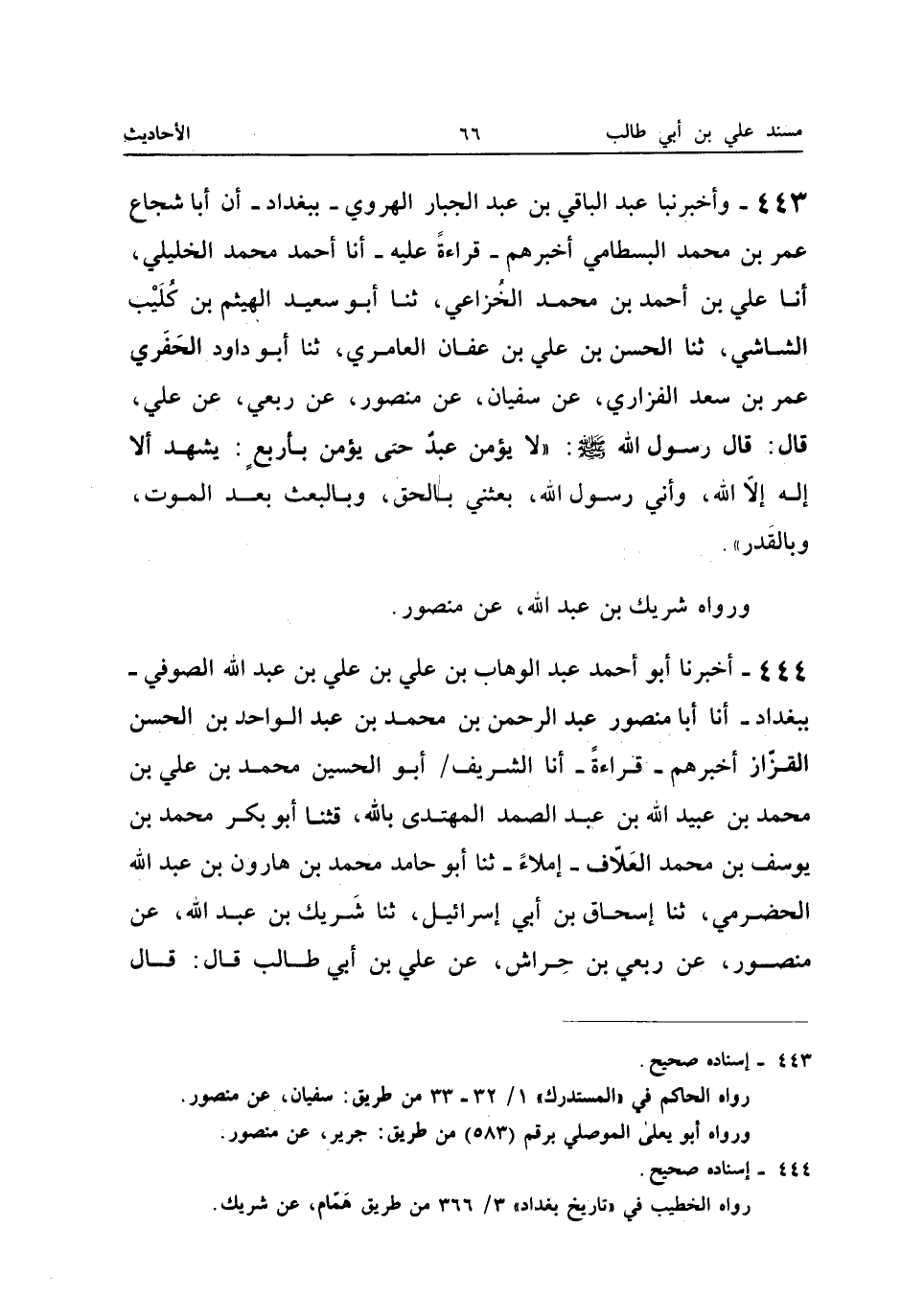 ٤٤٣ - وَأَخْبَرَنَا عَبْدُ الْبَاقِي بْنُ عَبْدِ الْجَبَّارِ الْهَرَوِيُّ - بِبَغْدَادَ - أَنَّ أَبَا شُجَاعٍ عُمَرَ بْنَ مُحَمَّدٍ الْبِسْطَامِيَّ أَخْبَرَهُمْ - قِرَاءَةً عَلَيْهِ - أَنَا أَحْمَدُ مُحَمَّدٌ الْخَلِيلِيُّ، أَنَا عَلِيُّ بْنُ أَحْمَدَ بْنِ مُحَمَّدٍ الْخُزَاعِيُّ، ثَنَا أَبُو سَعِيدٍ الْهَيْثَمُ بْنُ كُلَيْبٍ الشَّاشِيُّ، ثَنَا الْحَسَنُ بْنُ عَلِيِّ بْنِ عَفَّانَ الْعَامِرِيُّ، ثَنَا أَبُو دَاوُدَ الْحَفَرِيُّ، عُمَرُ بْنُ سَعْدٍ الْفَزَارِيُّ، عَنْ سُفْيَانَ، عَنْ مَنْصُورٍ، عَنْ رِبْعِيٍّ، عَنْ عَلِيٍّ قَالَ: قَالَ رَسُولُ اللهِ - صَلَّى اللهُ عَلَيْهِ وَسَلَّمَ-: «لَا يُؤْمِنُ عَبْدٌ حَتَّى يُؤْمِنَ بِأَرْبَعٍ: يَشْهَدُ أَلَّا إِلَهَ إِلَّا اللهُ، وَأَنِّي رَسُولُ اللهِ، بَعَثَنِي بِالْحَقِّ، وَبِالْبَعْثِ بَعْدَ الْمَوْتِ، وَبِالْقَدَرِ».