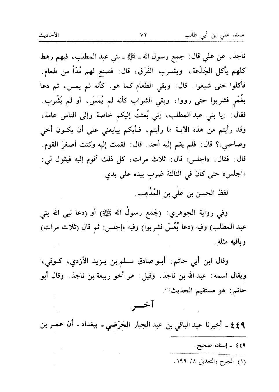 مُحَمَّدٍ الْبِسْطَامِيَّ أَخْبَرَهُمْ - قِرَاءَةً عَلَيْهِ - أَنَا أَحْمَدُ بْنُ مُحَمَّدٍ الْخَلِيلِيُّ، أَنَا عَلِيُّ بْنُ أَحْمَدَ الْخُزَاعِيُّ، أَنَا الْهَيْثَمُ بْنُ كُلَيْبٍ، ثَنَا الْعَبَّاسُ الدُّورِيُّ، ثَنَا الْفَيْضُ بْنُ الْفَضْلِ الْبَجَلِيُّ، ثَنَا مِسْعَرُ بْنُ كِدَامٍ، عَنْ سَلَمَةَ بْنِ كُهَيْلٍ، عَنْ أَبِي صَادِقٍ، عَنْ رَبِيعَةَ بْنِ نَاجِذٍ، قَالَ: سَمِعْتُ عَلِيَّ بْنَ أَبِي طَالِبٍ قَالَ: قَالَ رَسُولُ اللهِ - صَلَّى اللهُ عَلَيْهِ وَسَلَّمَ-: «الْأَئِمَّةُ مِنْ قُرَيْشٍ».