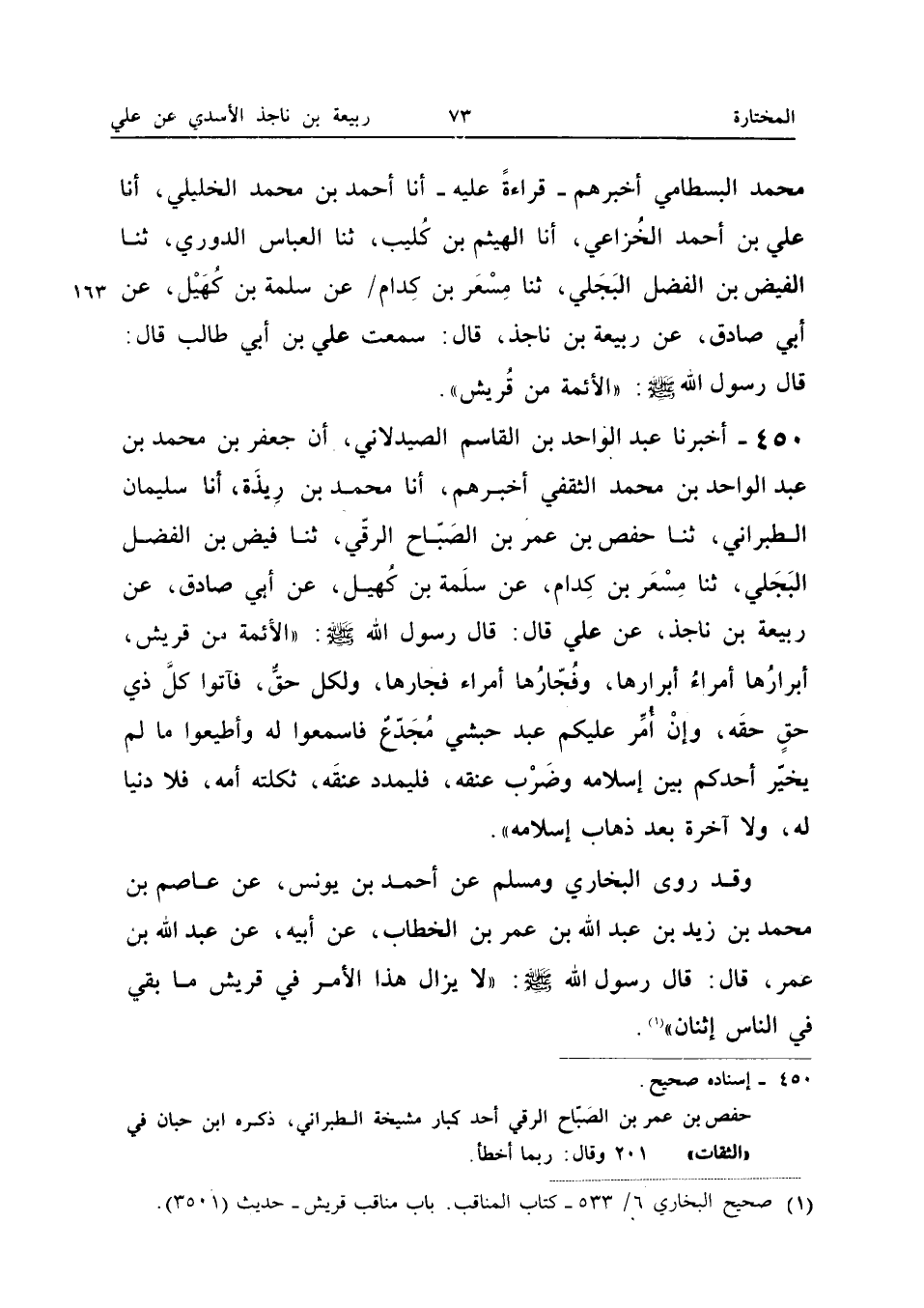 ٤٥٠ - أَخْبَرَنَا عَبْدُ الْوَاحِدِ بْنُ الْقَاسِمِ الصَّيْدَلَانِيُّ، أَنَّ جَعْفَرَ بْنَ مُحَمَّدِ بْنِ عَبْدِ الْوَاحِدِ بْنِ مُحَمَّدٍ الثَّقَفِيَّ أَخْبَرَهُمْ، أَنَا مُحَمَّدُ بْنُ رِيذَةَ، أَنَا سُلَيْمَانُ الطَّبَرَانِيُّ، ثَنَا حَفْصُ بْنُ عُمَرَ بْنِ الصَّبَّاحِ الرَّقِّيُّ، ثَنَا فَيْضُ بْنُ الْفَضْلِ الْبَجَلِيُّ، ثَنَا مِسْعَرُ بْنُ كِدَامٍ، عَنْ سَلَمَةَ بْنِ كُهَيْلٍ، عَنْ أَبِي صَادِقٍ، عَنْ رَبِيعَةَ بْنِ نَاجِذٍ، عَنْ عَلِيٍّ قَالَ: قَالَ رَسُولُ اللهِ -صَلَّى اللهُ عَلَيْهِ وَسَلَّمَ-: «الْأَئِمَّةُ مِنْ قُرَيْشٍ، أَبْرَارُهَا أُمَرَاءُ أَبْرَارِهَا، وَفُجَّارُهَا أُمَرَاءُ فُجَّارِهَا، وَلِكُلٍّ حَقٌّ، فَآتُوا كُلَّ ذِي حَقٍّ حَقَّهُ، وَإِنْ أُمِّرَ عَلَيْكُمْ عَبْدٌ حَبَشِيٌّ مُجَدَّعٌ، فَاسْمَعُوا لَهُ وَأَطِيعُوا، مَا لَمْ يُخَيَّرْ أَحَدَكُمْ بَيْنَ إِسْلَامِهِ وَضَرْبِ عُنُقِهِ، فَلْيَمْدُدْ عُنُقَهُ، ثَكِلَتْهُ أُمُّهُ، فَلَا دُنْيَا لَهُ وَلَا آخِرَةَ بَعْدَ ذَهَابِ إِسْلَامِهِ».