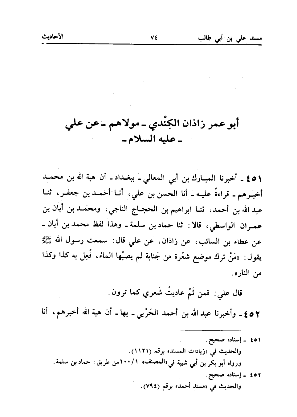 ٤٥١ - أَخْبَرَنَا الْمُبَارَكُ بْنُ أَبِي الْمَعَالِي - بِبَغْدَادَ - أَنَّ هِبَةَ اللهِ بْنَ مُحَمَّدٍ أَخْبَرَهُمْ - قِرَاءَةً عَلَيْهِ - أَنَا الْحَسَنُ بْنُ عَلِيٍّ، أَنَا أَحْمَدُ بْنُ جَعْفَرٍ، ثَنَا عَبْدُ اللهِ بْنُ أَحْمَدَ، ثَنَا إِبْرَاهِيمُ بْنُ الْحَجَّاجِ النَّاجِي، وَمُحَمَّدُ بْنُ أَبَانَ بْنِ عِمْرَانَ الْوَاسِطِيُّ قَالَا: ثَنَا حَمَّادُ بْنُ سَلَمَةَ - وَهَذَا لَفْظُ مُحَمَّدِ بْنِ أَبَانَ - عَنْ عَطَاءِ بْنِ السَّائِبِ، عَنْ زَاذَانَ، عَنْ عَلِيٍّ قَالَ: سَمِعْتُ رَسُولَ اللهِ - صَلَّى اللهُ عَلَيْهِ وَسَلَّمَ - يَقُولُ: «مَنْ تَرَكَ مَوْضِعَ شَعَرَةٍ مِنْ جَنَابَةٍ لَمْ يُصِبْهَا الْمَاءُ، فُعِلَ بِهِ كَذَا وَكَذَا مِنَ النَّارِ.