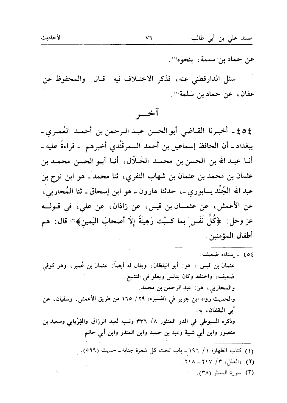 ٤٥٤ - أَخْبَرَنَا الْقَاضِي أَبُو الْحَسَنِ عَبْدُ الرَّحْمَنِ بْنُ أَحْمَدَ الْعُمَرِيُّ - بِبَغْدَادَ - أَنَّ الْحَافِظَ إِسْمَاعِيلَ بْنَ أَحْمَدَ السَّمَرْقَنْدِيَّ أَخْبَرَهُمْ - قِرَاءَةً عَلَيْهِ - أَنَا عَبْدُ اللهِ بْنُ الْحَسَنِ بْنِ مُحَمَّدٍ الْخَلَّالُ، أَنَا أَبُو الْحَسَنِ مُحَمَّدُ بْنُ عُثْمَانَ بْنِ مُحَمَّدِ بْنِ عُثْمَانَ بْنِ شِهَابٍ النَّفَرِيُّ، ثَنَا مُحَمَّدٌ - هُوَ ابْنُ نُوحِ بْنِ عَبْدِ اللهِ الْجُنْدَيْسَابُورِيُّ - حَدَّثَنَا هَارُونُ -هُوَ ابْنُ إِسْحَاقَ - ثَنَا الْمُحَارِبِيُّ، عَنِ الْأَعْمَشِ، عَنْ عُثْمَانَ بْنِ قَيْسٍ، عَنْ زَاذَانَ، عَنْ عَلِيٍّ «فِي قَوْلِهِ -عَزَّ وَجَلَّ -: {كُلُّ نَفْسٍ بِمَا كَسَبَتْ رَهِينَةٌ * إِلا أَصْحَابَ الْيَمِينِ}.