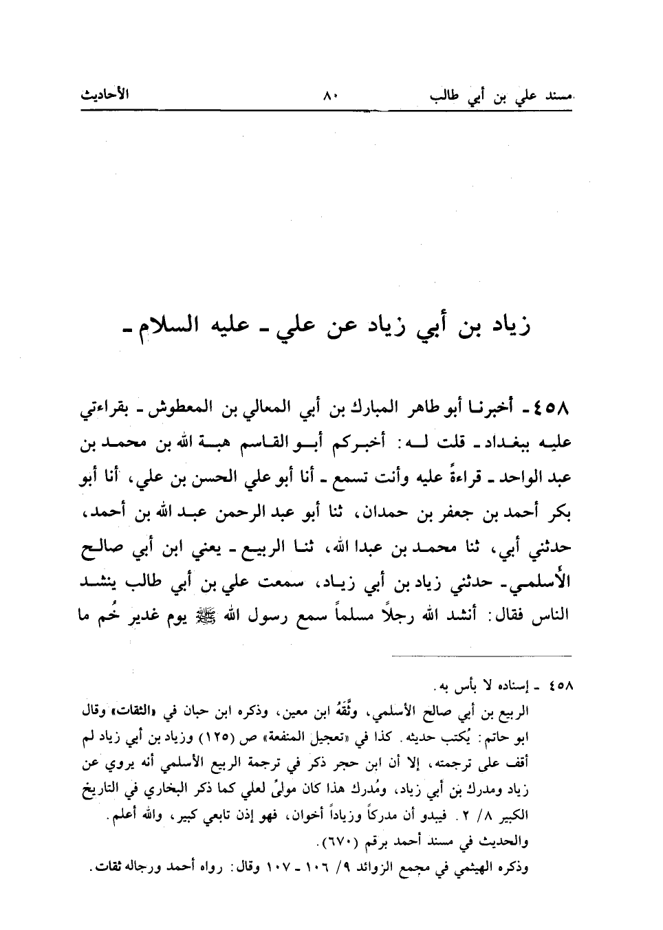 ٤٥٨ - أَخْبَرَنَا أَبُو طَاهِرٍ الْمُبَارَكُ بْنُ أَبِي الْمَعَالِي بْنِ الْمَعْطُوشِ - بِقِرَاءَتِي عَلَيْهِ بِبَغْدَادَ - قُلْتُ لَهُ: أَخْبَرَكُمْ أَبُو الْقَاسِمِ هِبَةُ اللهِ بْنُ مُحَمَّدِ بْنِ عَبْدِ الْوَاحِدِ - قِرَاءَةً عَلَيْهِ وَأَنْتَ تَسْمَعُ - أَنَا أَبُو عَلِيٍّ الْحَسَنُ بْنُ عَلِيٍّ، أَنَا أَبُو بَكْرٍ أَحْمَدُ بْنُ جَعْفَرِ بْنِ حَمْدَانَ، ثَنَا أَبُو عَبْدِ الرَّحْمَنِ عَبْدُ اللهِ بْنُ أَحْمَدَ، حَدَّثَنِي أَبِي، ثَنَا مُحَمَّدُ بْنُ عَبْدِ اللهِ، ثَنَا الرَّبِيعُ -يَعْنِي: ابْنَ أَبِي صَالِحٍ الْأَسْلَمِيَّ - حَدَّثَنِي زِيَادُ بْنُ أَبِي زِيَادٍ، «سَمِعْتُ عَلِيَّ بْنَ أَبِي طَالِبٍ يَنْشُدُ النَّاسَ، فَقَالَ: أَنْشُدُ اللهَ رَجُلًا مُسْلِمًا سَمِعَ رَسُولَ اللهِ - صَلَّى اللهُ عَلَيْهِ وَسَلَّمَ - يَوْمَ غَدِيرِ خُمٍّ مَا