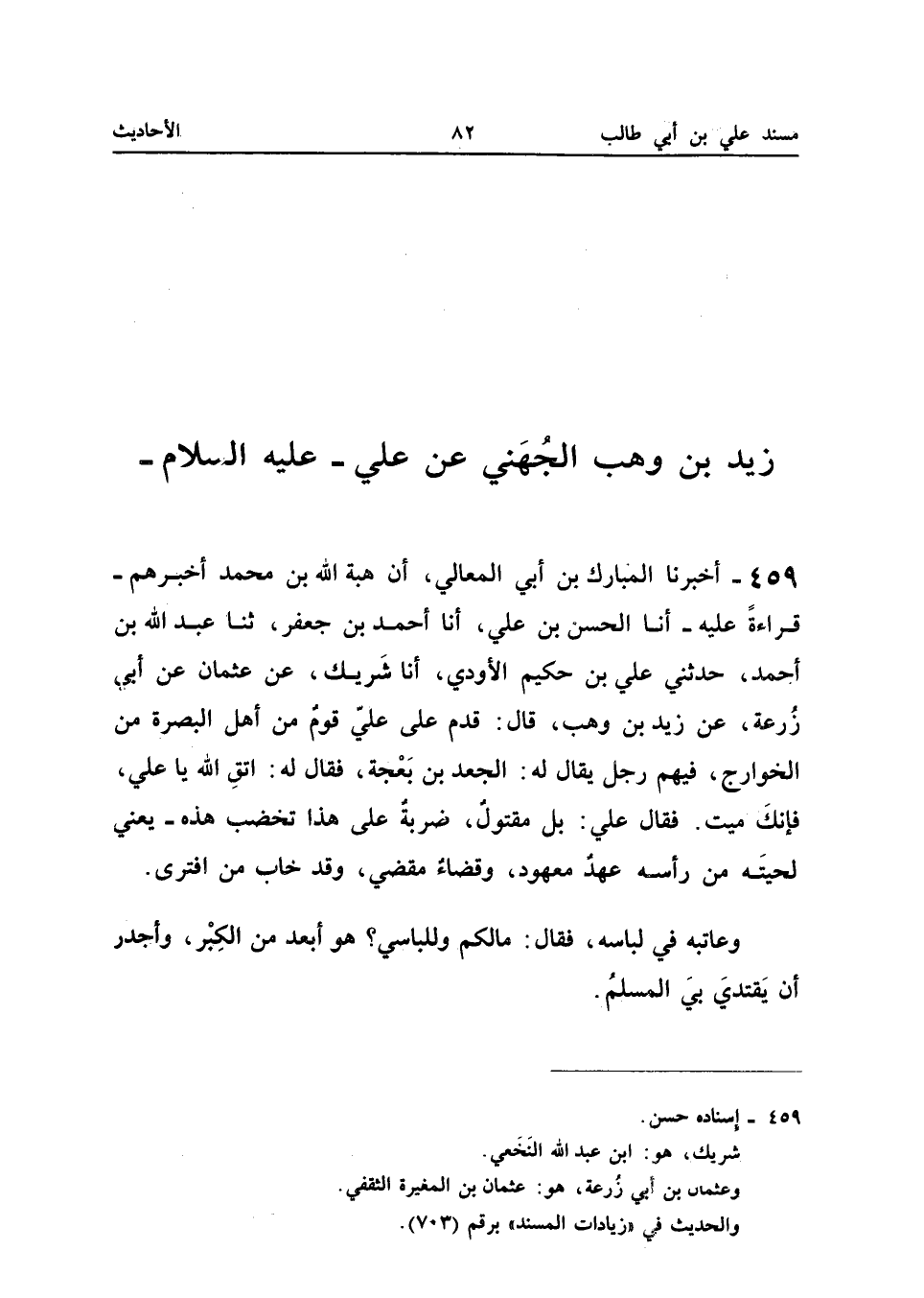 ٤٥٩ - أَخْبَرَنَا الْمُبَارَكُ بْنُ أَبِي الْمَعَالِي، أَنَّ هِبَةَ اللهِ بْنَ مُحَمَّدٍ أَخْبَرَهُمْ - قِرَاءَةً عَلَيْهِ - أَنَا الْحَسَنُ بْنُ عَلِيٍّ، أَنَا أَحْمَدُ بْنُ جَعْفَرٍ، ثَنَا عَبْدُ اللهِ بْنُ أَحْمَدَ، حَدَّثَنِي عَلِيُّ بْنُ حَكِيمٍ الْأَوْدِيُّ، أَنَا شَرِيكٌ، عَنْ عُثْمَانَ بْنِ (¬١) أَبِي زُرْعَةَ، عَنْ زَيْدِ بْنِ وَهْبٍ قَالَ: «قَدِمَ عَلَى عَلِيٍّ قَوْمٌ مِنْ أَهْلِ الْبَصْرَةِ مِنَ الْخَوَارِجِ فِيهِمْ رَجُلٌ يُقَالُ لَهُ: الْجَعْدُ بْنُ بَعْجَةَ، فَقَالَ لَهُ: اتَّقِ اللهَ يَا عَلِيُّ، فَإِنَّكَ مَيِّتٌ. فَقَالَ عَلِيٌّ: بَلْ مَقْتُولٌ، ضَرْبَةٌ عَلَى هَذَا تَخْضِبُ هَذِهِ - يَعْنِي لِحْيَتَهُ مِنْ رَأْسِهِ - عَهْدٌ مَعْهُودٌ، وَقَضَاءٌ مَقْضِيٌّ، وَقَدْ خَابَ مَنِ افْتَرَى.