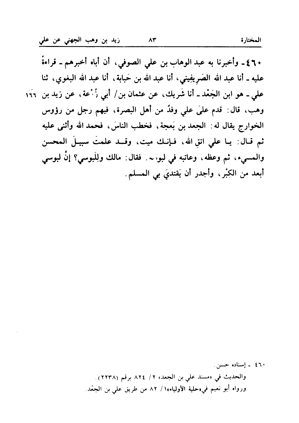٤٦٠ - وَأَخْبَرَنَا بِهِ عَبْدُ الْوَهَّابِ بْنُ عَلِيٍّ الصُّوفِيُّ، أَنَّ أَبَاهُ أَخْبَرَهُمْ - قِرَاءَةً عَلَيْهِ - أَنَا عَبْدُ اللهِ الصَّرِيفِينِيُّ، أَنَا عَبْدُ اللهِ بْنُ حَبَابَةَ، أَنَا عَبْدُ اللهِ الْبَغَوِيُّ، ثَنَا عَلِيٌّ - هُوَ ابْنُ الْجَعْدِ - أَنَا شَرِيكٌ، عَنْ عُثْمَانَ بْنِ أَبِي زُرْعَةَ، عَنْ زَيْدِ بْنِ وَهْبٍ قَالَ: «قَدِمَ عَلَى عَلِيٍّ وَفْدٌ مِنْ أَهْلِ الْبَصْرَةِ، فِيهِمْ رَجُلٌ مِنْ رُؤُوسِ الْخَوَارِجِ يُقَالُ لَهُ: الْجَعْدُ بْنُ بَعْجَةَ، فَخَطَبَ النَّاسَ، فَحَمِدَ اللهَ وَأَثْنَى عَلَيْهِ، ثُمَّ قَالَ: يَا عَلِيُّ اتَّقِ اللهَ، فَإِنَّكَ مَيِّتٌ، وَقَدْ عَلِمْتَ سَبِيلَ الْمُحْسِنِ وَالْمُسِيءِ، ثُمَّ وَعَظَهُ وَعَاتَبَهُ فِي لَبُوسِهِ، فَقَالَ: مَا لَكَ وَلِلَبُوسِي؟ إِنَّ لَبُوسِي أَبْعَدُ مِنَ الْكِبْرِ، وَأَجْدَرُ أَنْ يَقْتَدِيَ بِيَ الْمُسْلِمُ.»