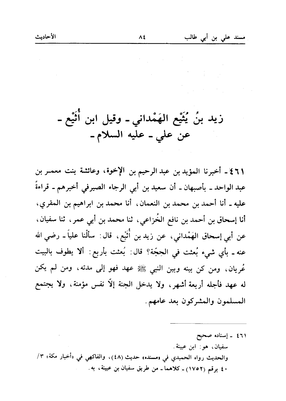 ٤٦١ - أَخْبَرَنَا الْمُؤَيَّدُ بْنُ عَبْدِ الرَّحِيمِ بْنِ الْإِخْوَةِ، وَعَائِشَةُ بِنْتُ مَعْمَرِ بْنِ عَبْدِ الْوَاحِدِ - بِأَصْبَهَانَ - أَنَّ سَعِيدَ بْنَ أَبِي الرَّجَاءِ الصَّيْرَفِيَّ أَخْبَرَهُمْ - قِرَاءَةً عَلَيْهِ - أَنَا أَحْمَدُ بْنُ مُحَمَّدِ بْنِ النُّعْمَانِ، أَنَا مُحَمَّدُ بْنُ إِبْرَاهِيمَ بْنِ الْمُقْرِئِ، أَنَا إِسْحَاقُ بْنُ أَحْمَدَ بْنِ نَافِعٍ الْخُزَاعِيُّ، ثَنَا مُحَمَّدُ بْنُ أَبِي عُمَرَ، ثَنَا سُفْيَانُ، عَنْ أَبِي إِسْحَاقَ الْهَمْدَانِيِّ، عَنْ زَيْدِ بْنِ أُثَيْعٍ قَالَ: «سَأَلْنَا عَلِيًّا -رَضِيَ اللهُ عَنْهُ - بِأَيِّ شَيْءٍ بُعِثْتَ فِي الْحِجَّةِ؟ قَالَ: بُعِثْتُ بِأَرْبَعٍ: أَلَّا يَطُوفَ بِالْبَيْتِ عُرْيَانٌ، وَمَنْ كَانَ بَيْنَهُ وَبَيْنَ النَّبِيِّ - صَلَّى اللهُ عَلَيْهِ وَسَلَّمَ - عَهْدٌ فَهُوَ إِلَى مُدَّتِهِ، وَمَنْ لَمْ يَكُنْ لَهُ عَهْدٌ فَأَجَلُهُ أَرْبَعَةُ أَشْهُرٍ، وَلَا يَدْخُلُ الْجَنَّةَ إِلَّا نَفْسٌ مُؤْمِنَةٌ، وَلَا يَجْتَمِعُ الْمُسْلِمُونَ وَالْمُشْرِكُونَ بَعْدَ عَامِهِمْ».