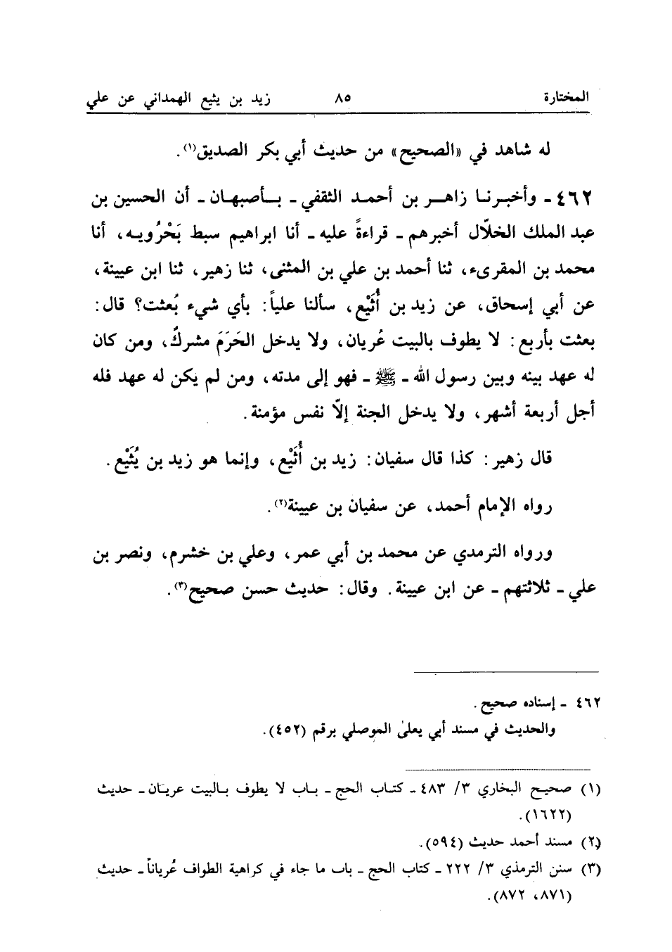 ٤٦٢ - وَأَخْبَرَنَا زَاهِرُ بْنُ أَحْمَدَ الثَّقَفِيُّ - بِأَصْبَهَانَ - أَنَّ الْحُسَيْنَ بْنَ عَبْدِ الْمَلِكِ الْخَلَّالَ، أَخْبَرَهُمْ - قِرَاءَةً عَلَيْهِ - أَنَا إِبْرَاهِيمُ سِبْطُ بَحْرَوَيْهِ، أَنَا مُحَمَّدُ بْنُ الْمُقْرِئِ، ثَنَا أَحْمَدُ بْنُ عَلِيِّ بْنِ الْمُثَنَّى، ثَنَا زُهَيْرٌ، ثَنَا ابْنُ عُيَيْنَةَ، عَنْ أَبِي إِسْحَاقَ، عَنْ زَيْدِ بْنِ أُثَيْعٍ، «سَأَلْنَا عَلِيًّا: بِأَيِّ شَيْءٍ بُعِثْتَ؟ قَالَ: بُعِثْتُ بِأَرْبَعٍ: لَا يَطُوفُ بِالْبَيْتِ عُرْيَانٌ، وَلَا يَدْخُلُ الْحَرَمَ مُشْرِكٌ، وَمَنْ كَانَ لَهُ عَهْدٌ بَيْنَهُ وَبَيْنَ رَسُولِ اللهِ - صَلَّى اللهُ عَلَيْهِ وَسَلَّمَ - فَهُوَ إِلَى مُدَّتِهِ، وَمَنْ لَمْ يَكُنْ لَهُ عَهْدٌ فَلَهُ أَجَلٌ، أَرْبَعَةُ أَشْهُرٍ، وَلَا يَدْخُلُ الْجَنَّةَ إِلَّا نَفْسٌ مُؤْمِنَةٌ».
