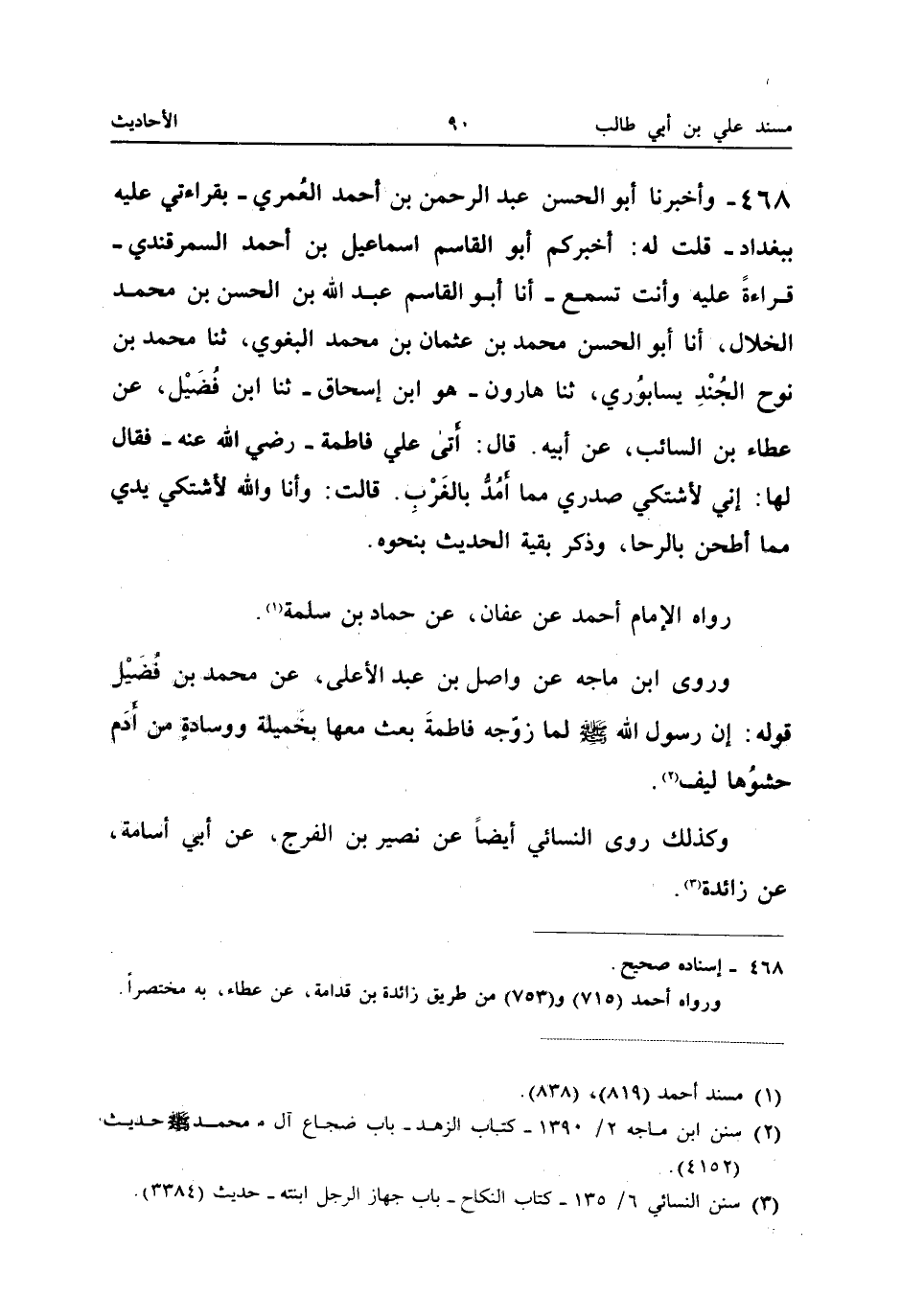 ٤٦٨ - وَأَخْبَرَنَا أَبُو الْحَسَنِ عَبْدُ الرَّحْمَنِ بْنُ أَحْمَدَ الْعُمَرِيُّ - بِقِرَاءَتِي عَلَيْهِ بِبَغْدَادَ - قُلْتُ لَهُ: أَخْبَرَكُمْ أَبُو الْقَاسِمِ إِسْمَاعِيلُ بْنُ أَحْمَدَ السَّمَرْقَنْدِيُّ - قِرَاءَةً عَلَيْهِ وَأَنْتَ تَسْمَعُ - أَنَا أَبُو الْقَاسِمِ عَبْدُ اللهِ بْنُ الْحَسَنِ بْنِ مُحَمَّدٍ الْخَلَّالُ، أَنَا أَبُو الْحَسَنِ مُحَمَّدُ بْنُ عُثْمَانَ بْنِ مُحَمَّدٍ الْبَغَوِيُّ (١)، ثَنَا مُحَمَّدُ بْنُ نُوحٍ الْجُنْدَيْسَابُورِيُّ، ثَنَا هَارُونُ - هُوَ ابْنُ إِسْحَاقَ - ثَنَا ابْنُ فُضَيْلٍ، عَنْ عَطَاءِ بْنِ السَّائِبِ، عَنْ أَبِيهِ قَالَ: «أَتَى عَلِيٌّ فَاطِمَةَ -رَضِيَ اللهُ عَنْهُ - فَقَالَ لَهَا: إِنِّي لَأَشْتَكِيَ صَدْرِي مِمَّا أَمُدُّ بِالْغَرْبِ، قَالَتْ: وَأَنَا وَاللهِ لَأَشْتَكِيَ يَدِي مِمَّا أَطْحَنُ بِالرَّحَا»، وَذَكَرَ بَقِيَّةَ الْحَدِيثِ بِنَحْوِهِ.