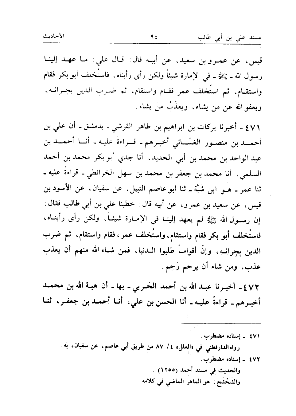 ٤٧١ - أَخْبَرَنَا بَرَكَاتُ بْنُ إِبْرَاهِيمَ بْنِ طَاهِرٍ الْقُرَشِيُّ - بِدِمَشْقَ - أَنَّ عَلِيَّ بْنَ أَحْمَدَ بْنِ مَنْصُورٍ الْغَسَّانِيَّ أَخْبَرَهُمْ - قِرَاءَةً عَلَيْهِ - أَنَا أَحْمَدُ بْنُ عَبْدِ الْوَاحِدِ بْنِ مُحَمَّدِ بْنِ أَبِي الْحَدِيدِ، أَنَا جَدِّي أَبُو بَكْرٍ مُحَمَّدُ بْنُ أَحْمَدَ السُّلَمِيُّ، أَنَا مُحَمَّدُ بْنُ جَعْفَرِ بْنِ مُحَمَّدِ بْنِ سَهْلٍ الْخَرَائِطِيُّ - قِرَاءَةً عَلَيْهِ - ثَنَا عُمَرُ - هُوَ ابْنُ شَبَّةَ - ثَنَا أَبُو عَاصِمٍ النَّبِيلُ، عَنْ سُفْيَانَ، عَنِ الْأَسْوَدِ بْنِ قَيْسٍ، عَنْ سَعِيدِ بْنِ عَمْرٍو، عَنْ أَبِيهِ قَالَ: «خَطَبَنَا عَلِيُّ بْنُ أَبِي طَالِبٍ، فَقَالَ: إِنَّ رَسُولَ اللهِ - صَلَّى اللهُ عَلَيْهِ وَسَلَّمَ - لَمْ يَعْهَدْ إِلَيْنَا فِي الْإِمَارَةِ شَيْئًا، وَلَكِنْ رَأْيٌ رَأَيْنَاهُ، فَاسْتُخْلِفَ أَبُو بَكْرٍ، فَقَامَ وَاسْتَقَامَ، وَاسْتُخْلِفَ عُمَرُ، فَقَامَ وَاسْتَقَامَ، ثُمَّ ضَرَبَ الدِّينُ بِجِرَانِهِ، وَإِنَّ أَقْوَامًا طَلَبُوا الدُّنْيَا، فَمَنْ شَاءَ اللهُ مِنْهُمْ أَنْ يُعَذِّبَ عَذَّبَ، وَمَنْ شَاءَ أَنْ يَرْحَمَ رَحِمَ».