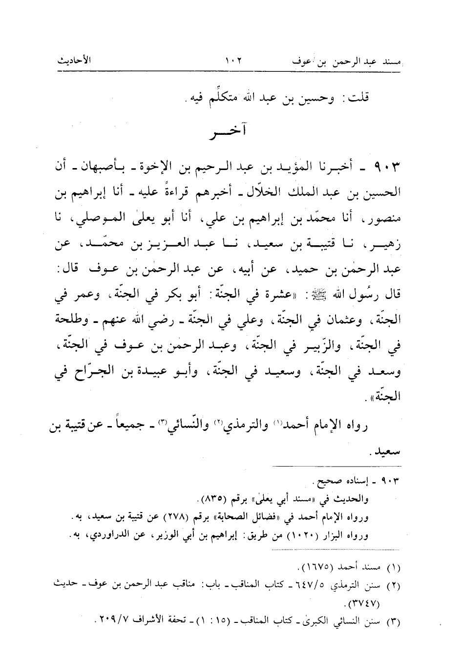 ٩٠٣ - أَخْبَرَنَا الْمُؤَيَّدُ بْنُ عَبْدِ الرَّحِيمِ بْنِ الْإِخْوَةِ بِأَصْبَهَانَ، أَنَّ الْحُسَيْنَ بْنَ عَبْدِ الْمَلِكِ الْخَلَّالَ أَخْبَرَهُمْ قِرَاءَةً عَلَيْهِ، أَنَا إِبْرَاهِيمُ بْنُ مَنْصُورٍ، أَنَا مُحَمَّدُ بْنُ إِبْرَاهِيمَ بْنِ عَلِيٍّ، أَنَا أَبُو يَعْلَى الْمَوْصِلِيُّ، نَا زُهَيْرٌ، نَا قُتَيْبَةُ بْنُ سَعِيدٍ، نَا عَبْدُ الْعَزِيزِ بْنُ مُحَمَّدٍ، عَنْ عَبْدِ الرَّحْمَنِ بْنِ حُمَيْدٍ، عَنْ أَبِيهِ، عَنْ عَبْدِ الرَّحْمَنِ بْنِ عَوْفٍ قَالَ: قَالَ رَسُولُ اللهِ صَلَّى اللهُ عَلَيْهِ وَسَلَّمَ: «عَشَرَةٌ فِي الْجَنَّةِ: أَبُو بَكْرٍ فِي الْجَنَّةِ، وَعُمَرُ فِي الْجَنَّةِ، وَعُثْمَانُ فِي الْجَنَّةِ، وَعَلِيٌّ فِي الْجَنَّةِ رَضِيَ اللهُ عَنْهُمْ، وَطَلْحَةُ فِي الْجَنَّةِ، وَالزُّبَيْرُ فِي الْجَنَّةِ، وَعَبْدُ الرَّحْمَنِ بْنُ عَوْفٍ فِي الْجَنَّةِ، وَسَعْدٌ فِي الْجَنَّةِ، وَسَعِيدٌ فِي الْجَنَّةِ، وَأَبُو عُبَيْدَةَ بْنُ الْجَرَّاحِ فِي الْجَنَّةِ».