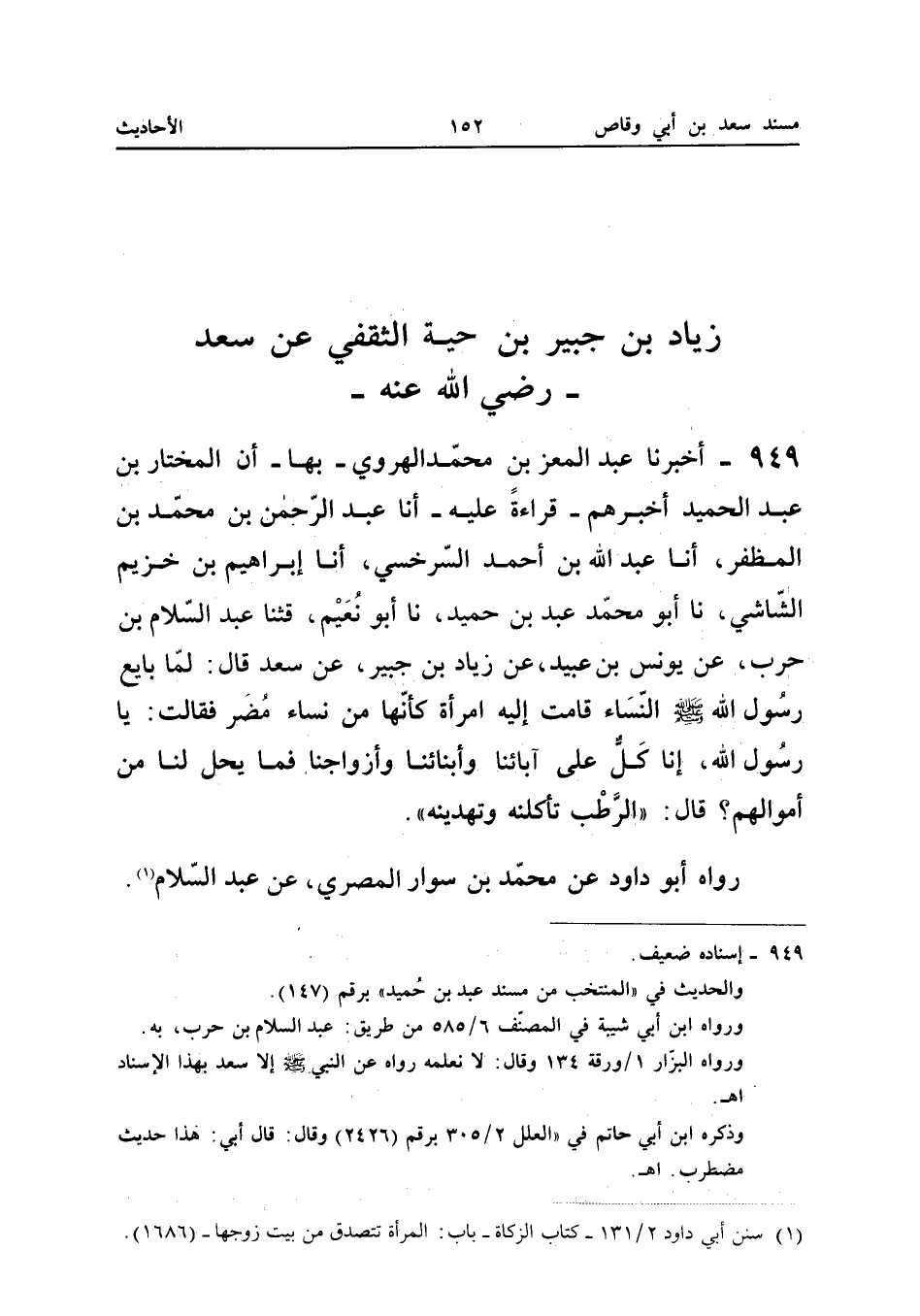 ٩٤٩ - أَخْبَرَنَا عَبْدُ الْمُعِزِّ بْنُ مُحَمَّدٍ الْهَرَوِيُّ بِهَا، أَنَّ الْمُخْتَارَ بْنَ عَبْدِ الْحَمِيدِ أَخْبَرَهُمْ قِرَاءَةً عَلَيْهِ، أَنَا عَبْدُ الرَّحْمَنِ بْنُ مُحَمَّدِ بْنِ الْمُظَفَّرِ، أَنَا عَبْدُ اللهِ بْنُ أَحْمَدَ السَّرَخْسِيُّ، أَنَا إِبْرَاهِيمُ بْنُ خُزَيْمٍ الشَّاشِيُّ، نَا أَبُو مُحَمَّدٍ عَبْدُ بْنُ حُمَيْدٍ، نَا أَبُو نُعَيْمٍ، قَثَنَا عَبْدُ السَّلَامِ بْنُ حَرْبٍ، عَنْ يُونُسَ بْنِ عُبَيْدٍ، عَنْ زِيَادِ بْنِ جُبَيْرٍ، عَنْ سَعْدٍ قَالَ: «لَمَّا بَايَعَ رَسُولُ اللهِ صَلَّى اللهُ عَلَيْهِ وَسَلَّمَ النِّسَاءَ قَامَتْ إِلَيْهِ امْرَأَةٌ كَأَنَّهَا مِنْ نِسَاءِ مُضَرَ، فَقَالَتْ: يَا رَسُولَ اللهِ، إِنَّا كَلٌّ عَلَى آبَائِنَا وَأَبْنَائِنَا وَأَزْوَاجِنَا فَمَا يَحِلُّ لَنَا مِنْ أَمْوَالِهِمْ؟ قَالَ: الرَّطْبُ تَأْكُلْنَهُ وَتُهْدِينَهُ».