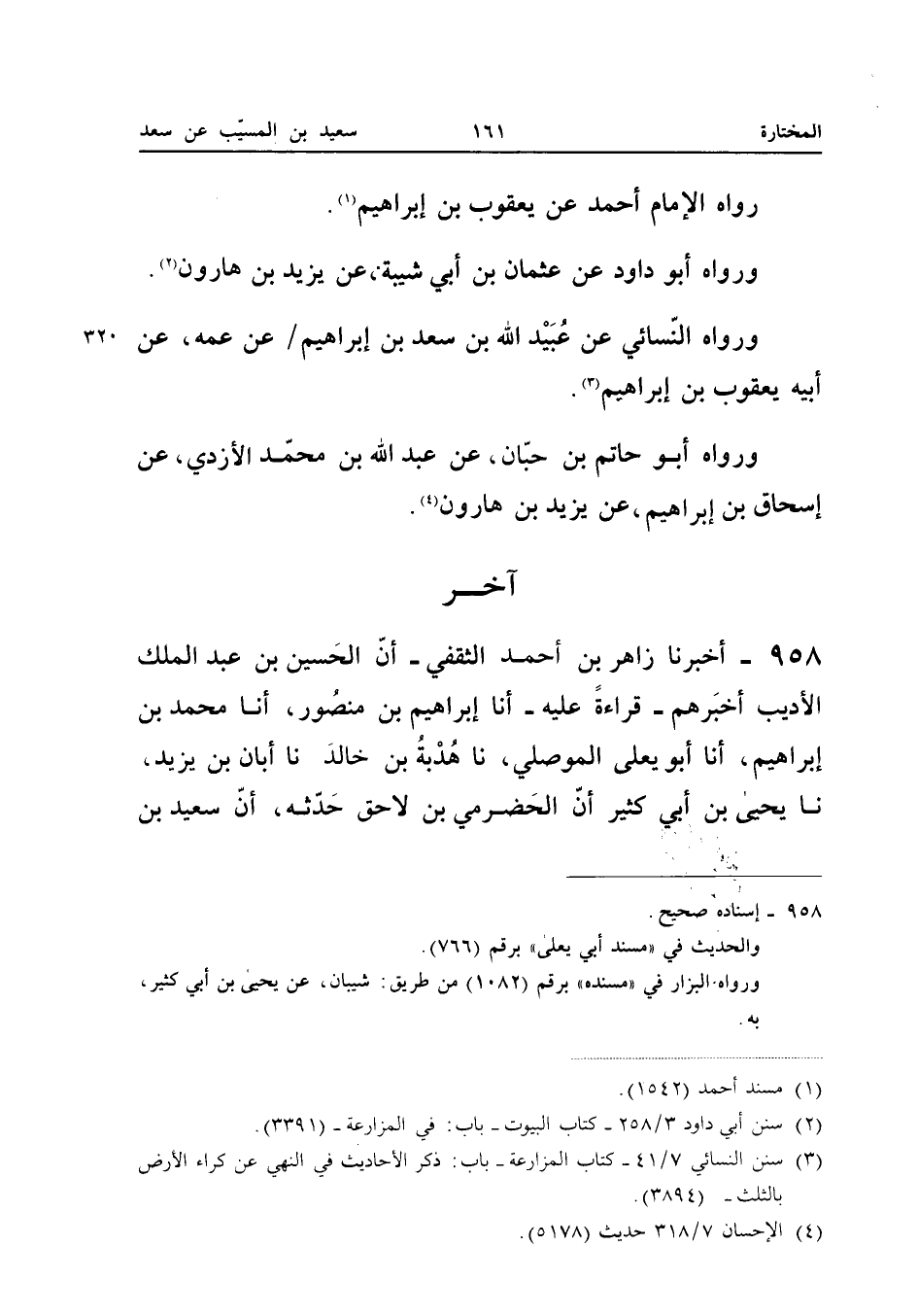 ٩٥٨ - أَخْبَرَنَا زَاهِرُ بْنُ أَحْمَدَ الثَّقَفِيُّ، أَنَّ الْحُسَيْنَ بْنَ عَبْدِ الْمَلِكِ الْأَدِيبَ أَخْبَرَهُمْ قِرَاءَةً عَلَيْهِ، أَنَا إِبْرَاهِيمُ بْنُ مَنْصُورٍ، أَنَا مُحَمَّدُ بْنُ إِبْرَاهِيمَ، أَنَا أَبُو يَعْلَى الْمَوْصِلِيُّ، نَا هُدْبَةُ بْنُ خَالِدٍ، نَا أَبَانُ بْنُ يَزِيدَ، نَا يَحْيَى بْنُ أَبِي كَثِيرٍ، أَنَّ الْحَضْرَمِيَّ بْنَ لَاحِقٍ حَدَّثَهُ، أَنَّ سَعِيدَ بْنَ