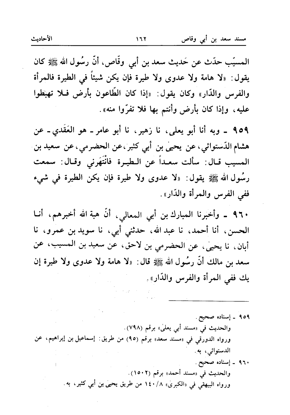 ٩٥٩ - وَبِهِ، أَنَا أَبُو يَعْلَى، نَا زُهَيْرٌ، نَا أَبُو عَامِرٍ - هُوَ الْعَقَدِيُّ -، عَنْ هِشَامٍ الدَّسْتُوَائِيِّ، عَنْ يَحْيَى بْنِ أَبِي كَثِيرٍ، عَنِ الْحَضْرَمِيِّ، عَنْ سَعِيدِ بْنِ الْمُسَيِّبِ قَالَ: «سَأَلْتُ سَعْدًا عَنِ الطِّيَرَةِ فَانْتَهَرَنِي وَقَالَ: سَمِعْتُ رَسُولَ اللهِ صَلَّى اللهُ عَلَيْهِ وَسَلَّمَ يَقُولُ: لَا عَدْوَى وَلَا طِيَرَةَ، فَإِنْ يَكُنِ الطِّيَرَةُ فِي شَيْءٍ فَفِي الْفَرَسِ وَالْمَرْأَةِ وَالدَّارِ».