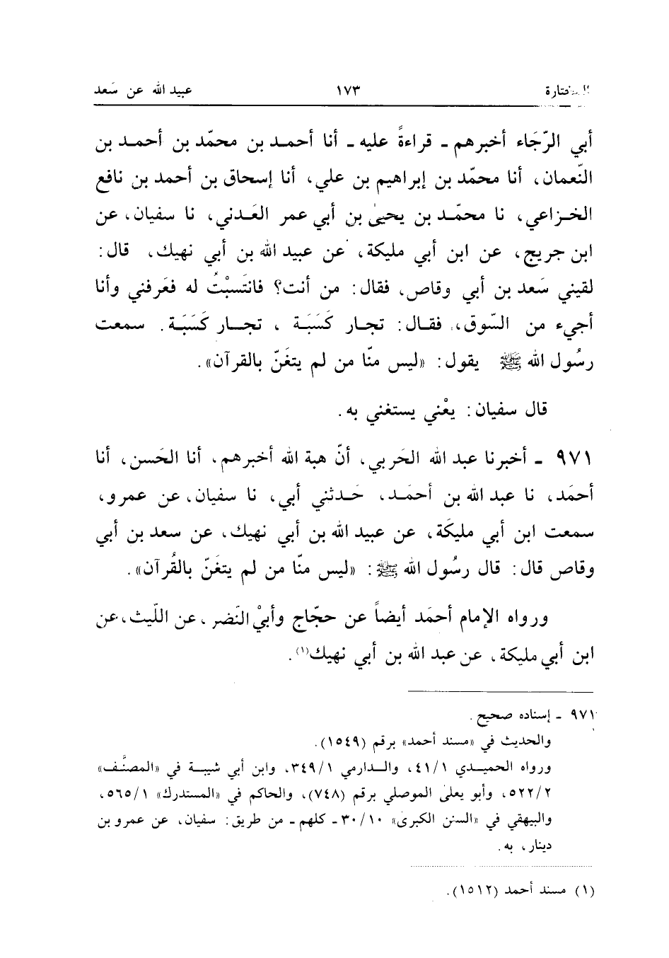 ٩٧١ - أَخْبَرَنَا عَبْدُ اللهِ الْحَرْبِيُّ، أَنَّ هِبَةَ اللهِ أَخْبَرَهُمْ، أَنَا الْحَسَنُ، أَنَا أَحْمَدُ، نَا عَبْدُ اللهِ بْنُ أَحْمَدَ، حَدَّثَنِي أَبِي، نَا سُفْيَانُ، عَنْ عَمْرٍو، سَمِعْتُ ابْنَ أَبِي مُلَيْكَةَ، عَنْ عُبَيْدِ اللهِ بْنِ أَبِي نَهِيكٍ، عَنْ سَعْدِ بْنِ أَبِي وَقَّاصٍ قَالَ: قَالَ رَسُولُ اللهِ صَلَّى اللهُ عَلَيْهِ وَسَلَّمَ: «لَيْسَ مِنَّا مَنْ لَمْ يَتَغَنَّ بِالْقُرْآنِ».