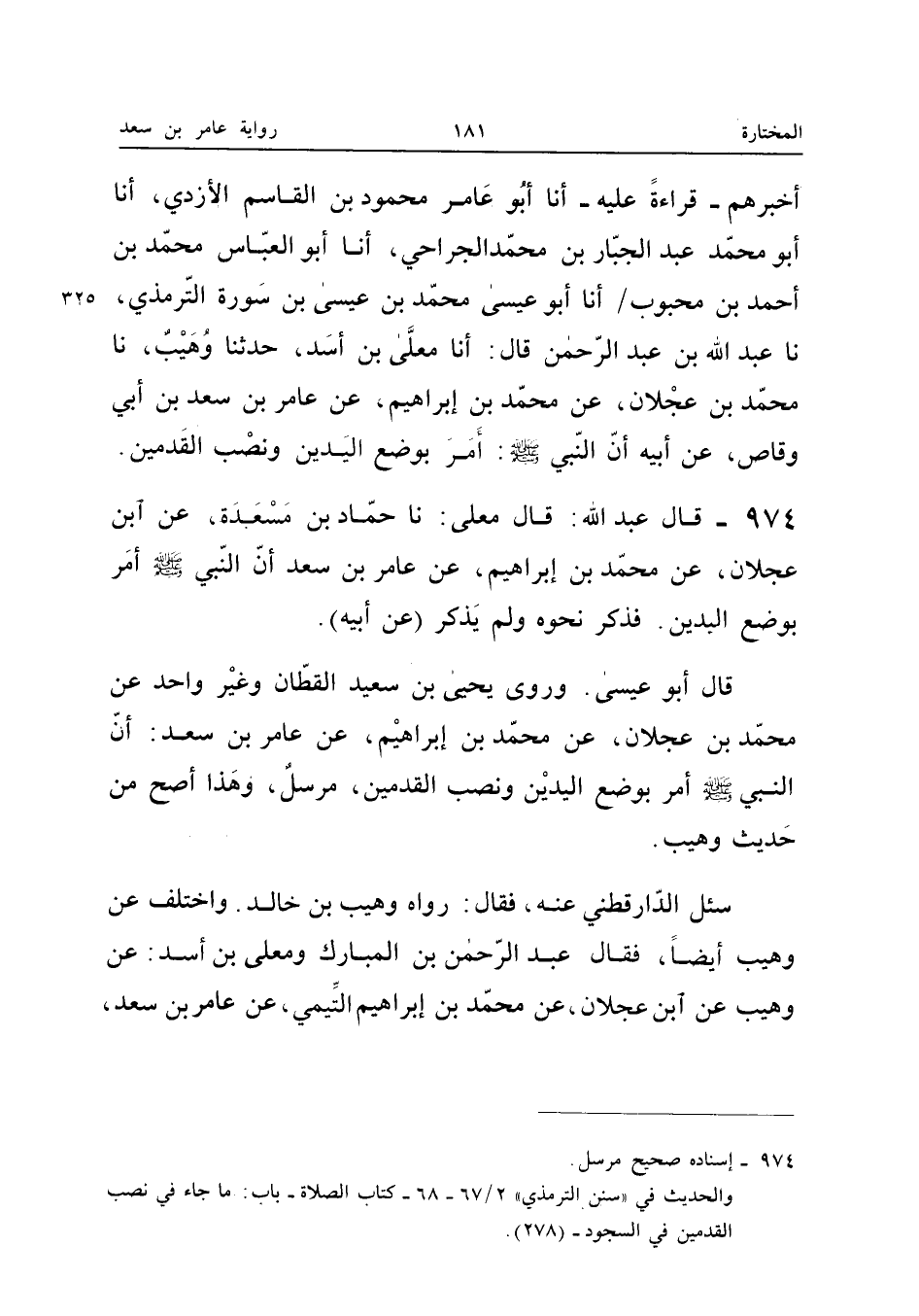 قَالَ أَبُو عِيسَى: وَرَوَى يَحْيَى بْنُ سَعِيدٍ الْقَطَّانُ وَغَيْرُ وَاحِدٍ، عَنْ مُحَمَّدِ بْنِ عَجْلَانَ، عَنْ مُحَمَّدِ بْنِ إِبْرَاهِيمَ، عَنْ عَامِرِ بْنِ سَعْدٍ: أَنَّ النَّبِيَّ صَلَّى اللهُ عَلَيْهِ وَسَلَّمَ أَمَرَ بِوَضْعِ الْيَدَيْنِ وَنَصْبِ الْقَدَمَيْنِ، مُرْسَلٌ، وَهَذَا أَصَحُّ مِنْ حَدِيثِ وُهَيْبٍ.