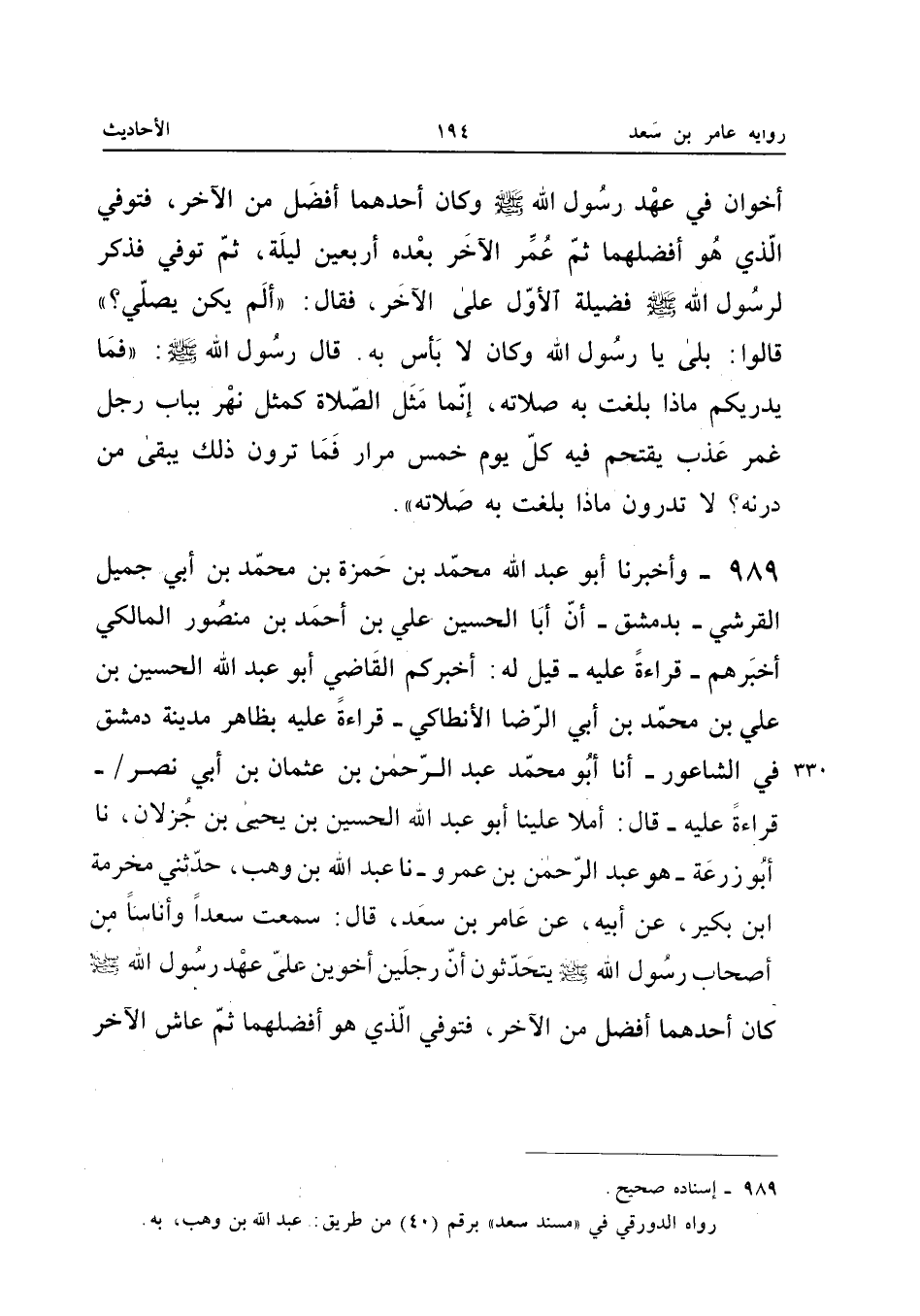 ٩٨٩ - وَأَخْبَرَنَا أَبُو عَبْدِ اللهِ مُحَمَّدُ بْنُ حَمْزَةَ بْنِ مُحَمَّدِ بْنِ أَبِي جَمِيلٍ الْقُرَشِيُّ بِدِمَشْقَ، أَنَّ أَبَا الْحُسَيْنِ عَلِيَّ بْنَ أَحْمَدَ بْنِ مَنْصُورٍ الْمَالِكِيَّ أَخْبَرَهُمْ قِرَاءَةً عَلَيْهِ، قِيلَ لَهُ: أَخْبَرَكُمُ الْقَاضِي أَبُو عَبْدِ اللهِ الْحُسَيْنُ بْنُ عَلِيِّ بْنِ مُحَمَّدِ بْنِ أَبِي الرِّضَا الْأَنْطَاكِيُّ قِرَاءَةً عَلَيْهِ بِظَاهِرِ مَدِينَةِ دِمَشْقَ فِي الشَّاعُورِ، أَنَا أَبُو مُحَمَّدٍ عَبْدُ الرَّحْمَنِ بْنُ عُثْمَانَ بْنِ أَبِي نَصْرٍ قِرَاءَةً عَلَيْهِ: قَالَ: أَمْلَى عَلَيْنَا أَبُو عَبْدِ اللهِ الْحُسَيْنُ بْنُ يَحْيَى بْنِ جَزْلَانَ، نَا أَبُو زُرْعَةَ - هُوَ عَبْدُ الرَّحْمَنِ بْنُ عَمْرٍو -، نَا عَبْدُ اللهِ بْنُ وَهْبٍ، حَدَّثَنِي مَخْرَمَةُ بْنُ بُكَيْرٍ، عَنْ أَبِيهِ، عَنْ عَامِرِ بْنِ سَعْدٍ قَالَ: سَمِعْتُ سَعْدًا وَأُنَاسًا مِنْ أَصْحَابِ رَسُولِ اللهِ صَلَّى اللهُ عَلَيْهِ وَسَلَّمَ يَتَحَدَّثُونَ «أَنَّ رَجُلَيْنِ أَخَوَيْنِ عَلَى عَهْدِ رَسُولِ اللهِ صَلَّى اللهُ عَلَيْهِ وَسَلَّمَ كَانَ أَحَدُهُمَا أَفْضَلَ مِنَ الْآخَرِ، فَتُوُفِّيَ الَّذِي هُوَ أَفْضَلُهُمَا، ثُمَّ عَاشَ الْآخَرُ