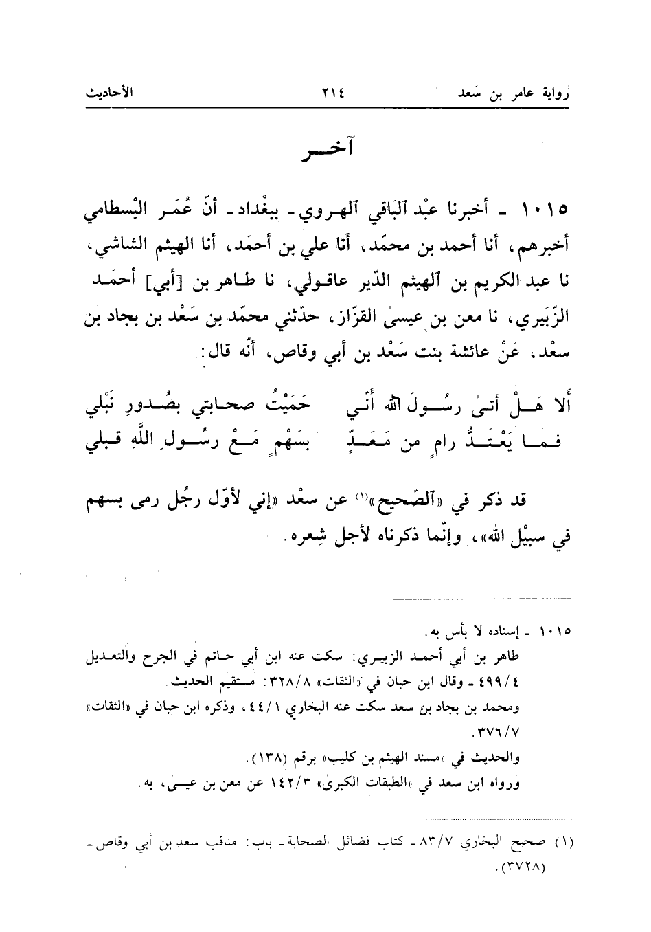 ١٠١٥ - أَخْبَرَنَا عَبْدُ الْبَاقِي الْهَرَوِيُّ بِبَغْدَادَ، أَنَّ عُمَرَ الْبِسْطَامِيَّ أَخْبَرَهُمْ، أَنَا أَحْمَدُ بْنُ مُحَمَّدٍ، أَنَا عَلِيُّ بْنُ أَحْمَدَ، أَنَا الْهَيْثَمُ الشَّاشِيُّ، نَا عَبْدُ الْكَرِيمِ بْنُ الْهَيْثَمِ الدَّيْرَعَاقُولِيُّ، نَا طَاهِرُ بْنُ أَبِي أَحْمَدَ الزُّبَيْرِيُّ، نَا مَعْنُ بْنُ عِيسَى الْقَزَّازُ، حَدَّثَنِي مُحَمَّدُ بْنُ سَعْدِ بْنِ بِجَادِ بْنِ سَعْدٍ، عَنْ عَائِشَةَ بِنْتِ سَعْدِ بْنِ أَبِي وَقَّاصٍ، أَنَّهُ قَالَ: