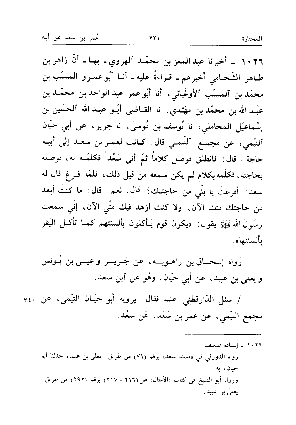 ١٠٢٦ - أَخْبَرَنَا عَبْدُ الْمُعِزِّ بْنُ مُحَمَّدٍ الْهَرَوِيُّ بِهَا، أَنَّ زَاهِرَ بْنَ طَاهِرٍ الشَّحَّامِيَّ أَخْبَرَهُمْ قِرَاءَةً عَلَيْهِ، أَنَا أَبُو عَمْرٍو الْمُسَيِّبُ بْنُ مُحَمَّدِ بْنِ الْمُسَيِّبِ الْأَوْغَيَانِيُّ (¬١)، أَنَا أَبُو عُمَرَ عَبْدُ الْوَاحِدِ بْنُ مُحَمَّدِ بْنِ عَبْدِ اللهِ بْنِ مُحَمَّدِ بْنِ مَهْدِيٍّ، نَا الْقَاضِي أَبُو عَبْدِ اللهِ الْحُسَيْنُ بْنُ إِسْمَاعِيلَ الْمَحَامِلِيُّ، نَا يُوسُفُ بْنُ مُوسَى، نَا جَرِيرٌ، عَنْ أَبِي حَيَّانَ التَّيْمِيِّ، عَنْ مُجَمِّعٍ التَّيْمِيِّ قَالَ: «كَانَتْ لِعُمَرَ بْنِ سَعْدٍ إِلَى أَبِيهِ حَاجَةٌ، قَالَ: فَانْطَلَقَ فَوَصَلَ كَلَامًا ثُمَّ أَتَى سَعْدًا فَكَلَّمَهُ بِهِ، فَوَصَلَهُ بِحَاجَتِهِ، فَكَلَّمَهُ بِكَلَامٍ لَمْ يَكُنْ سَمِعَهُ مِنْ قَبْلِ ذَلِكَ، فَلَمَّا فَرَغَ قَالَ لَهُ سَعْدٌ: أَفَرَغْتَ يَا بُنَيَّ مِنْ حَاجَتِكَ؟ قَالَ: نَعَمْ، قَالَ: مَا كُنْتَ أَبْعَدَ مِنْ حَاجَتِكَ مِنْكَ الْآنَ، وَلَا كُنْتُ أَزْهَدَ فِيكَ مِنِّي الْآنَ، إِنِّي سَمِعْتُ رَسُولَ اللهِ صَلَّى اللهُ عَلَيْهِ وَسَلَّمَ يَقُولُ: يَكُونُ قَوْمٌ يَأْكُلُونَ بِأَلْسِنَتِهِمْ كَمَا تَأْكُلُ الْبَقَرُ بِأَلْسِنَتِهَا».