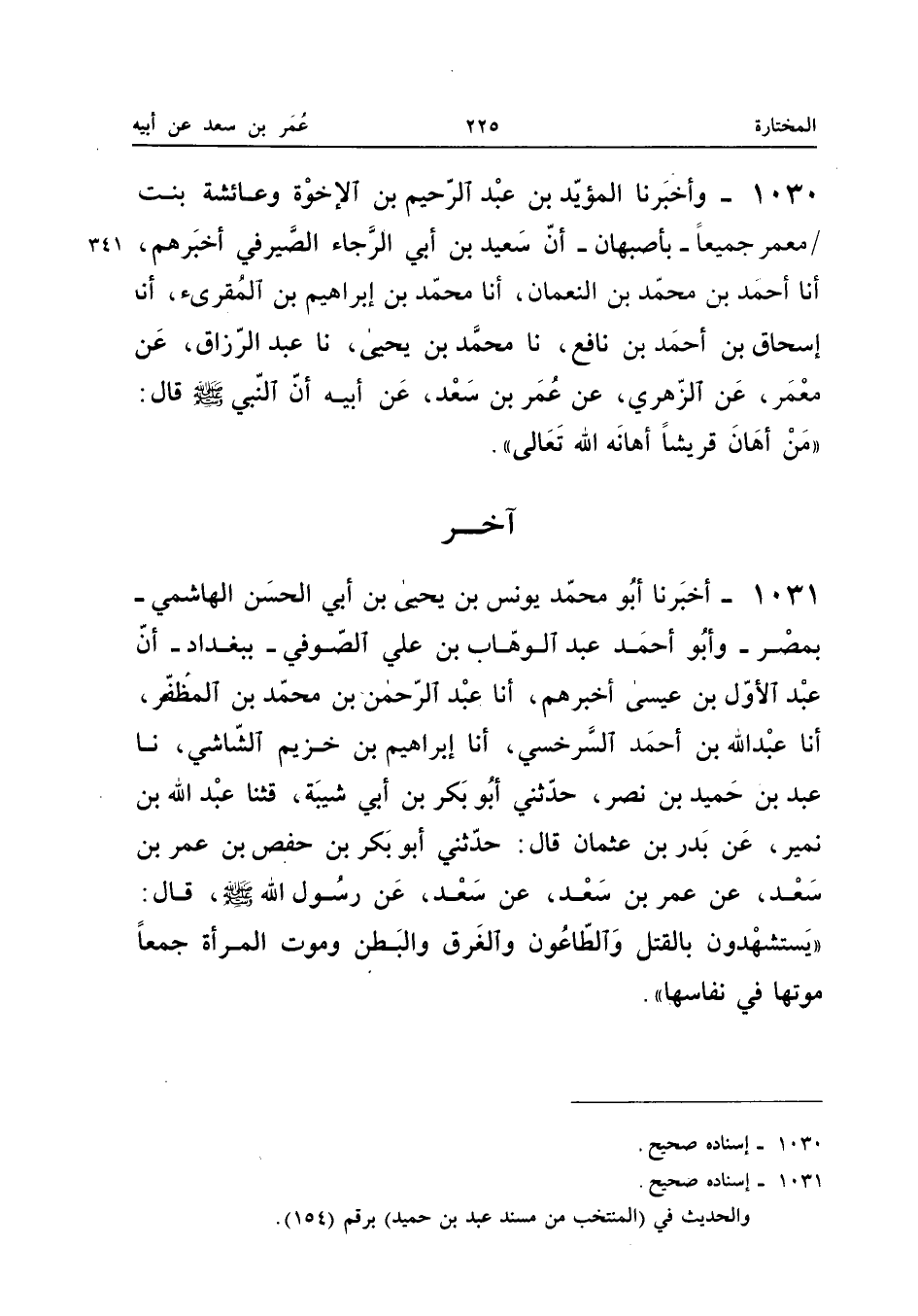 ١٠٣١ - أَخْبَرَنَا أَبُو مُحَمَّدٍ يُونُسُ بْنُ يَحْيَى بْنِ أَبِي الْحَسَنِ الْهَاشِمِيُّ بِمِصْرَ، وَأَبُو أَحْمَدَ عَبْدُ الْوَهَّابِ بْنُ عَلِيٍّ الصُّوفِيُّ بِبَغْدَادَ، أَنَّ عَبْدَ الْأَوَّلِ بْنَ عِيسَى أَخْبَرَهُمْ، أَنَا عَبْدُ الرَّحْمَنِ بْنُ مُحَمَّدِ بْنِ الْمُظَفَّرِ، أَنَا عَبْدُ اللهِ بْنُ أَحْمَدَ السَّرَخْسِيُّ، أَنَا إِبْرَاهِيمُ بْنُ خُزَيْمٍ الشَّاشِيُّ، نَا عَبْدُ بْنُ حُمَيْدِ بْنِ نَصْرٍ، حَدَّثَنِي أَبُو بَكْرِ بْنُ أَبِي شَيْبَةَ، قَثَنَا عَبْدُ اللهِ بْنُ نُمَيْرٍ، عَنْ بَدْرِ بْنِ عُثْمَانَ، قَالَ: حَدَّثَنِي أَبُو بَكْرِ بْنُ حَفْصِ بْنِ عُمَرَ بْنِ سَعْدٍ، عَنْ عُمَرَ بْنِ سَعْدٍ، عَنْ سَعْدٍ، عَنْ رَسُولِ اللهِ صَلَّى اللهُ عَلَيْهِ وَسَلَّمَ قَالَ: «يُسْتَشْهَدُونَ بِالْقَتْلِ وَالطَّاعُونِ وَالْغَرَقِ وَالْبَطْنِ وَمَوْتِ الْمَرْأَةِ جَمْعًا مَوْتِهَا فِي نِفَاسِهَا».