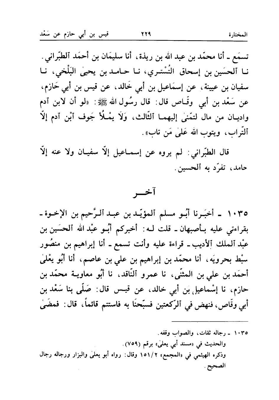 ١٠٣٥ - أَخْبَرَنَا أَبُو مُسْلِمٍ الْمُؤَيَّدُ بْنُ عَبْدِ الرَّحِيمِ بْنِ الْإِخْوَةِ بِقِرَاءَتِي عَلَيْهِ بِأَصْبَهَانَ، قُلْتُ لَهُ: أَخْبَرَكُمْ أَبُو عَبْدِ اللهِ الْحُسَيْنُ بْنُ عَبْدِ الْمَلِكِ الْأَدِيبُ قِرَاءَةً عَلَيْهِ وَأَنْتَ تَسْمَعُ، أَنَا إِبْرَاهِيمُ بْنُ مَنْصُورٍ سِبْطُ بَحْرَوَيْهِ، أَنَا مُحَمَّدُ بْنُ إِبْرَاهِيمَ بْنِ عَلِيِّ بْنِ عَاصِمٍ، أَنَا أَبُو يَعْلَى أَحْمَدُ بْنُ عَلِيِّ بْنِ الْمُثَنَّى، نَا عَمْرٌو النَّاقِدُ، نَا أَبُو مُعَاوِيَةَ مُحَمَّدُ بْنُ خَازِمٍ، نَا إِسْمَاعِيلُ بْنُ أَبِي خَالِدٍ، عَنْ قَيْسٍ قَالَ: «صَلَّى بِنَا سَعْدُ بْنُ أَبِي وَقَّاصٍ، فَنَهَضَ فِي الرَّكْعَتَيْنِ، فَسَبَّحْنَا بِهِ، فَاسْتَتَمَّ قَائِمًا، قَالَ: فَمَضَى