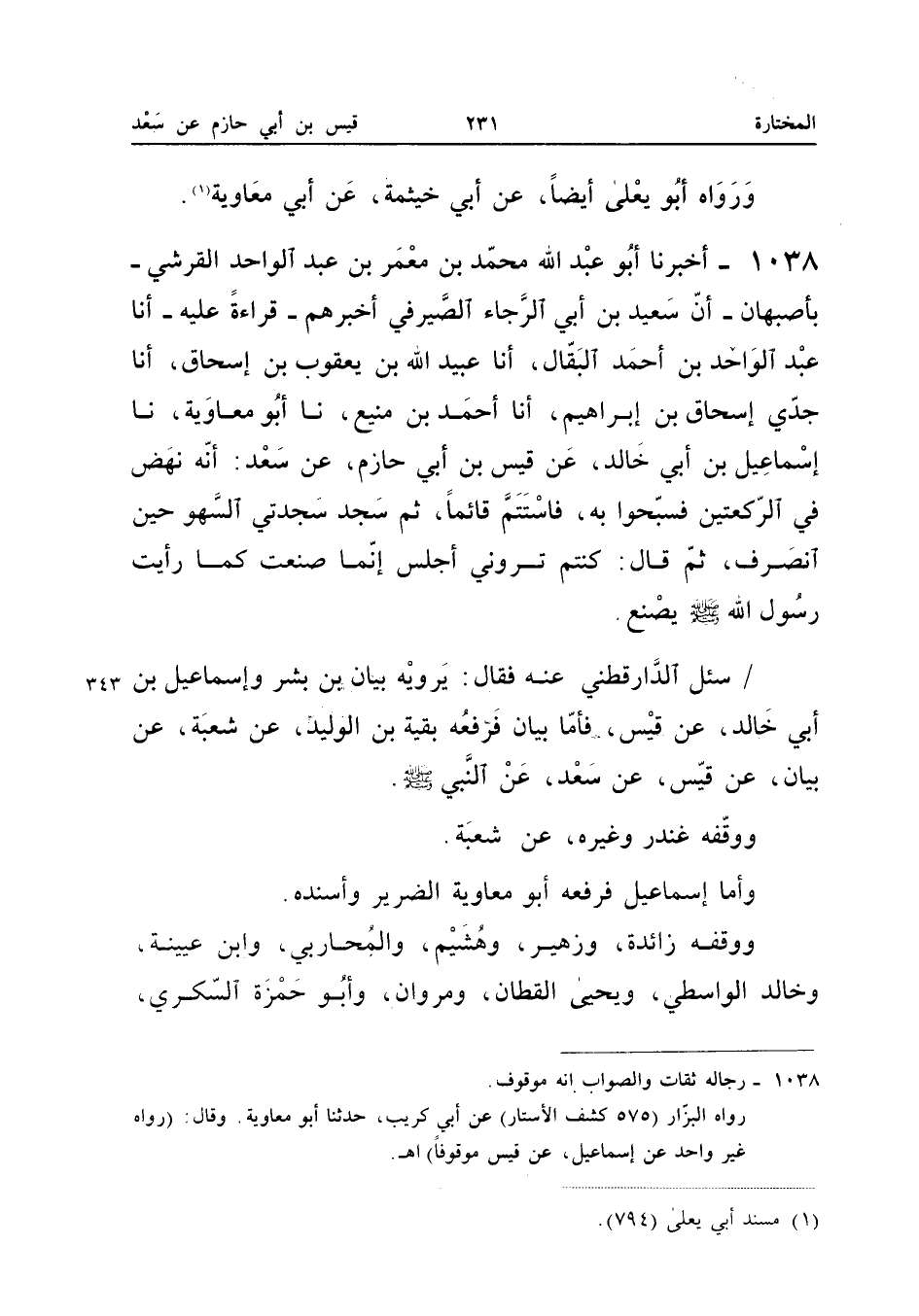١٠٣٨ - أَخْبَرَنَا أَبُو عَبْدِ اللهِ مُحَمَّدُ بْنُ مَعْمَرِ بْنِ عَبْدِ الْوَاحِدِ الْقُرَشِيُّ بِأَصْبَهَانَ، أَنَّ سَعِيدَ بْنَ أَبِي الرَّجَاءِ الصَّيْرَفِيَّ أَخْبَرَهُمْ قِرَاءَةً عَلَيْهِ، أَنَا عَبْدُ الْوَاحِدِ بْنُ أَحْمَدَ الْبَقَّالُ، أَنَا عُبَيْدُ اللهِ بْنُ يَعْقُوبَ بْنِ إِسْحَاقَ، أَنَا جَدِّي إِسْحَاقُ بْنُ إِبْرَاهِيمَ، أَنَا أَحْمَدُ بْنُ مَنِيعٍ، نَا أَبُو مُعَاوِيَةَ، نَا إِسْمَاعِيلُ بْنُ أَبِي خَالِدٍ، عَنْ قَيْسِ بْنِ أَبِي حَازِمٍ، «عَنْ سَعْدٍ أَنَّهُ نَهَضَ فِي الرَّكْعَتَيْنِ فَسَبَّحُوا بِهِ، فَاسْتَتَمَّ قَائِمًا، ثُمَّ سَجَدَ سَجْدَتَيِ السَّهْوِ حِينَ انْصَرَفَ، ثُمَّ قَالَ: كُنْتُمْ تَرَوْنِي أَجْلِسُ، إِنَّمَا صَنَعْتُ كَمَا رَأَيْتُ رَسُولَ اللهِ صَلَّى اللهُ عَلَيْهِ وَسَلَّمَ يَصْنَعُ».