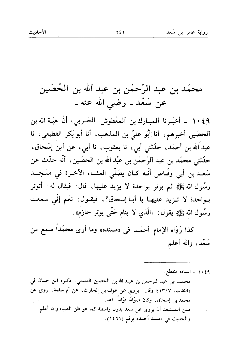 ١٠٤٩ - أَخْبَرَنَا الْمُبَارَكُ بْنُ الْمَعْطُوشِ الْحَرْبِيُّ (¬١)، أَنَّ هِبَةَ اللهِ بْنَ الْحُصَيْنِ أَخْبَرَهُمْ، أَنَا أَبُو عَلِيِّ بْنُ الْمُذْهِبِ، أَنَا أَبُو بَكْرٍ الْقَطِيعِيُّ، نَا عَبْدُ اللهِ بْنُ أَحْمَدَ، حَدَّثَنِي أَبِي، نَا يَعْقُوبُ، نَا أَبِي، عَنِ ابْنِ إِسْحَاقَ، حَدَّثَنِي مُحَمَّدُ بْنُ عَبْدِ الرَّحْمَنِ بْنِ عَبْدِ اللهِ بْنِ الْحُصَيْنِ، أَنَّهُ حَدَّثَ عَنْ سَعْدِ بْنِ أَبِي وَقَّاصٍ: «أَنَّهُ كَانَ يُصَلِّي الْعِشَاءَ الْآخِرَةَ فِي مَسْجِدِ رَسُولِ اللهِ صَلَّى اللهُ عَلَيْهِ وَسَلَّمَ، ثُمَّ يُوتِرُ بِوَاحِدَةٍ لَا يَزِيدُ عَلَيْهَا، قَالَ: فَيُقَالُ لَهُ: أَتُوتِرُ بِوَاحِدَةٍ لَا تَزِيدُ عَلَيْهَا يَا أَبَا إِسْحَاقَ؟ فَيَقُولُ: نَعَمْ، إِنِّي سَمِعْتُ رَسُولَ اللهِ صَلَّى اللهُ عَلَيْهِ وَسَلَّمَ يَقُولُ: الَّذِي لَا يَنَامُ حَتَّى يُوتِرَ - حَازِمٌ».