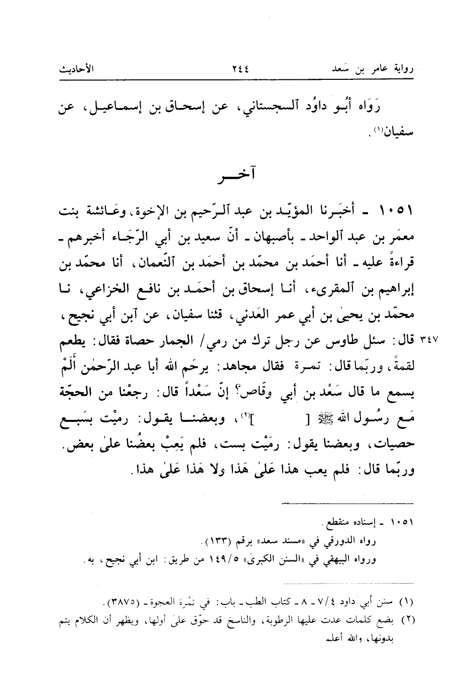 «سُئِلَ طَاوُسٌ عَنْ رَجُلٍ تَرَكَ مِنْ رَمْيِ الْجِمَارِ حَصَاةً، فَقَالَ: يُطْعِمُ لُقْمَةً، وَرُبَّمَا قَالَ: تَمْرَةً»، فَقَالَ مُجَاهِدٌ: يَرْحَمُ اللهُ أَبَا عَبْدِ الرَّحْمَنِ أَلَمْ يَسْمَعْ مَا قَالَ سَعْدُ بْنُ أَبِي وَقَّاصٍ؟ إِنَّ سَعْدًا قَالَ: رَجَعْنَا مِنَ الْحَجَّةِ مَعَ رَسُولِ اللهِ صَلَّى اللهُ عَلَيْهِ وَسَلَّمَ، وَبَعْضُنَا يَقُولُ: رَمَيْتُ بِسَبْعِ حَصَيَاتٍ، وَبَعْضُنَا يَقُولُ: رَمَيْتُ بِسِتٍّ، فَلَمْ يَعِبْ بَعْضُنَا عَلَى بَعْضٍ، وَرُبَّمَا قَالَ: فَلَمْ يَعِبْ هَذَا عَلَى هَذَا، وَلَا هَذَا عَلَى هَذَا.