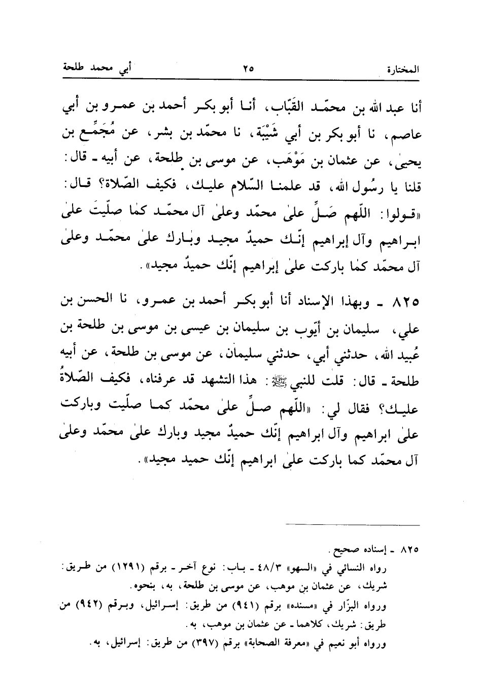 ٨٢٥ - وَبِهَذَا الْإِسْنَادِ، أَنَا أَبُو بَكْرٍ أَحْمَدُ بْنُ عَمْرٍو، نَا الْحَسَنُ بْنُ عَلِيٍّ، سُلَيْمَانُ بْنُ أَيُّوبَ بْنِ سُلَيْمَانَ بْنِ عِيسَى بْنِ مُوسَى بْنِ طَلْحَةَ بْنِ عُبَيْدِ اللهِ، حَدَّثَنِي أَبِي، حَدَّثَنِي سُلَيْمَانُ، عَنْ مُوسَى بْنِ طَلْحَةَ، عَنْ أَبِيهِ طَلْحَةَ، قَالَ: «قُلْتُ لِلنَّبِيِّ صَلَّى اللهُ عَلَيْهِ وَسَلَّمَ: هَذَا التَّشَهُّدُ قَدْ عَرَفْنَاهُ، فَكَيْفَ الصَّلَاةُ عَلَيْكَ؟ فَقَالَ لِي: اللَّهُمَّ صَلِّ عَلَى مُحَمَّدٍ كَمَا صَلَّيْتَ عَلَى إِبْرَاهِيمَ وَآلِ إِبْرَاهِيمَ إِنَّكَ حَمِيدٌ مَجِيدٌ، وَبَارِكْ عَلَى مُحَمَّدٍ وَعَلَى آلِ مُحَمَّدٍ كَمَا بَارَكْتَ عَلَى إِبْرَاهِيمَ إِنَّكَ حَمِيدٌ مَجِيدٌ».