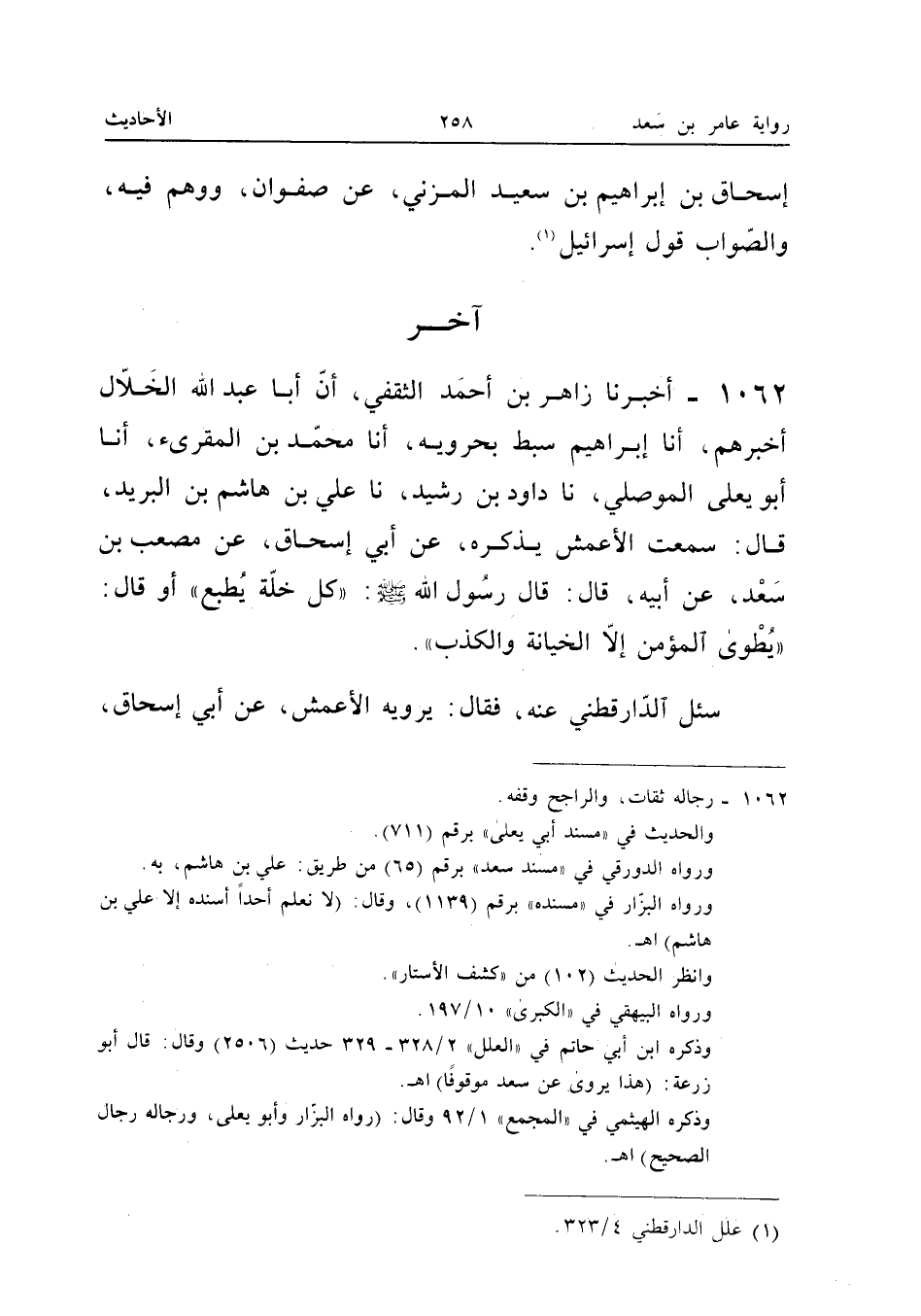 ١٠٦٢ - أَخْبَرَنَا زَاهِرُ بْنُ أَحْمَدَ الثَّقَفِيُّ، أَنَّ أَبَا عَبْدِ اللهِ الْخَلَّالَ أَخْبَرَهُمْ، أَنَا إِبْرَاهِيمُ سِبْطُ بَحْرَوَيْهِ، أَنَا مُحَمَّدُ بْنُ الْمُقْرِئِ، أَنَا أَبُو يَعْلَى الْمَوْصِلِيُّ، نَا دَاوُدُ بْنُ رُشَيْدٍ، نَا عَلِيُّ بْنُ هَاشِمِ بْنِ الْبَرِيدِ، قَالَ: سَمِعْتُ الْأَعْمَشَ يَذْكُرُهُ، عَنْ أَبِي إِسْحَاقَ، عَنْ مُصْعَبِ بْنِ سَعْدٍ، عَنْ أَبِيهِ قَالَ: قَالَ رَسُولُ اللهِ صَلَّى اللهُ عَلَيْهِ وَسَلَّمَ: «كُلُّ خَلَّةٍ يُطْبَعُ - أَوْ قَالَ: يُطْوَى - الْمُؤْمِنُ إِلَّا الْخِيَانَةَ وَالْكَذِبَ».