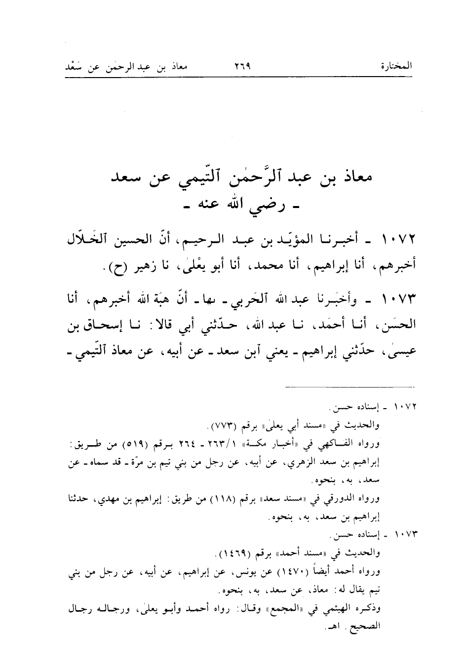 ١٠٧٣ - وَأَخْبَرَنَا عَبْدُ اللهِ الْحَرْبِيُّ بِهَا، أَنَّ هِبَةَ اللهِ أَخْبَرَهُمْ، أَنَا الْحَسَنُ، أَنَا أَحْمَدُ، نَا عَبْدُ اللهِ، حَدَّثَنِي أَبِي، قَالَا: نَا إِسْحَاقُ بْنُ عِيسَى، حَدَّثَنِي إِبْرَاهِيمُ - يَعْنِي: ابْنَ سَعْدٍ -، عَنْ أَبِيهِ، عَنْ مُعَاذٍ التَّيْمِيِّ