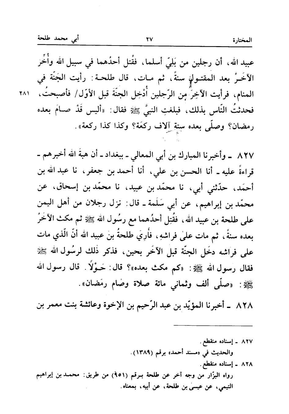 ٨٢٧ - وَأَخْبَرَنَا الْمُبَارَكُ بْنُ أَبِي الْمَعَالِي بِبَغْدَادَ، أَنَّ هِبَةَ اللهِ أَخْبَرَهُمْ قِرَاءَةً عَلَيْهِ، أَنَا الْحَسَنُ بْنُ عَلِيٍّ، أَنَا أَحْمَدُ بْنُ جَعْفَرٍ، نَا عَبْدُ اللهِ بْنُ أَحْمَدَ، حَدَّثَنِي أَبِي، نَا مُحَمَّدُ بْنُ عُبَيْدٍ، نَا مُحَمَّدُ بْنُ إِسْحَاقَ، عَنْ مُحَمَّدِ بْنِ إِبْرَاهِيمَ، عَنْ أَبِي سَلَمَةَ قَالَ: «نَزَلَ رَجُلَانِ مِنْ أَهْلِ الْيَمَنِ عَلَى طَلْحَةَ بْنِ عُبَيْدِ اللهِ، فَقُتِلَ أَحَدُهُمَا مَعَ رَسُولِ اللهِ صَلَّى اللهُ عَلَيْهِ وَسَلَّمَ ثُمَّ مَكَثَ الْآخَرُ بَعْدَهُ سَنَةً، ثُمَّ مَاتَ عَلَى فِرَاشِهِ، فَأُرِيَ طَلْحَةُ بْنُ عُبَيْدِ اللهِ أَنَّ الَّذِي مَاتَ عَلَى فِرَاشِهِ دَخَلَ الْجَنَّةَ قَبْلَ الْآخَرِ بِحِينٍ، فَذَكَرَ ذَلِكَ لِرَسُولِ اللهِ صَلَّى اللهُ عَلَيْهِ وَسَلَّمَ فَقَالَ رَسُولُ اللهِ صَلَّى اللهُ عَلَيْهِ وَسَلَّمَ: كَمْ مَكَثَ بَعْدَهُ؟ قَالَ: حَوْلًا، قَالَ رَسُولُ اللهِ صَلَّى اللهُ عَلَيْهِ وَسَلَّمَ: صَلَّى أَلْفَ وَثَمَانِيَ مِائَةِ صَلَاةٍ وَصَامَ رَمَضَانَ».