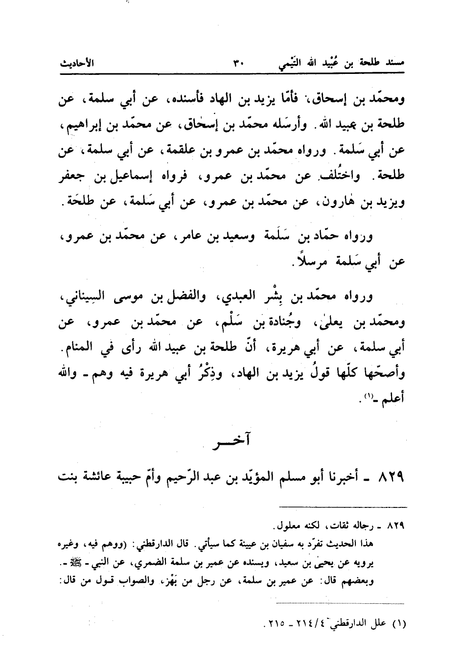 مَعْمَرِ بْنِ عَبْدِ الْوَاحِدِ بِأَصْبَهَانَ، أَنَّ سَعِيدَ بْنَ أَبِي الرَّجَاءِ أَخْبَرَهُمْ قِرَاءَةً عَلَيْهِ، أَنَا أَحْمَدُ بْنُ مُحَمَّدِ بْنِ النُّعْمَانِ، أَنَا أَبُو بَكْرٍ مُحَمَّدُ بْنُ إِبْرَاهِيمَ بْنِ عَلِيِّ بْنِ الْمُقْرِئِ، أَنَا إِسْحَاقُ بْنُ أَحْمَدَ بْنِ نَافِعٍ الْخُزَاعِيُّ، أَنَا أَبُو عَبْدِ اللهِ مُحَمَّدُ بْنُ يَحْيَى بْنِ أَبِي عُمَرَ الْعَدَنِيُّ، نَا سُفْيَانُ بْنُ عُيَيْنَةَ، عَنْ يَحْيَى بْنِ سَعِيدٍ، عَنْ مُحَمَّدِ بْنِ إِبْرَاهِيمَ بْنِ الْحَارِثِ التَّيْمِيِّ، عَنْ عِيسَى بْنِ طَلْحَةَ بْنِ عُبَيْدِ اللهِ، عَنْ أَبِيهِ، أَنَّهُ قَالَ: «كُنَّا مَعَ رَسُولِ اللهِ صَلَّى اللهُ عَلَيْهِ وَسَلَّمَ بِصَفَائِحِ الرَّوْحَاءِ، فَإِذَا نَحْنُ بِحِمَارٍ عَقِيرٍ، فَقَالَ النَّبِيُّ صَلَّى اللهُ عَلَيْهِ وَسَلَّمَ: هَذَا الْحِمَارُ يُوشِكُ أَنْ يَأْتِيَ طَالِبُهُ، قَالَ: فَمَا لَبِثْنَا أَنْ جَاءَ صَاحِبُهُ، فَقَالَ رَسُولُ اللهِ صَلَّى اللهُ عَلَيْهِ وَسَلَّمَ: خُذُوهُ، فَأَمَرَ رَسُولُ اللهِ صَلَّى اللهُ عَلَيْهِ وَسَلَّمَ أَبَا بَكْرٍ رَضِيَ اللهُ عَنْهُ أَنْ يُقَسِّمَهُ بَيْنَ الرِّفَاقِ، قَالَ: ثُمَّ خَرَجْنَا حَتَّى إِذَا كُنَّا بِأَثَايَةِ الْعَرْجِ إِذَا ظَبْيٌ فِيهِ سَهْمٌ، فَأَمَرَ رَسُولُ اللهِ صَلَّى اللهُ عَلَيْهِ وَسَلَّمَ أَبَا بَكْرٍ أَنْ يَقِفَ عَلَيْهِ فَيَمْنَعَهُ مِنَ النَّاسِ، قَالَ: وَصَاحِبُ الْحِمَارِ رَجُلٌ مِنْ بَهْزٍ».