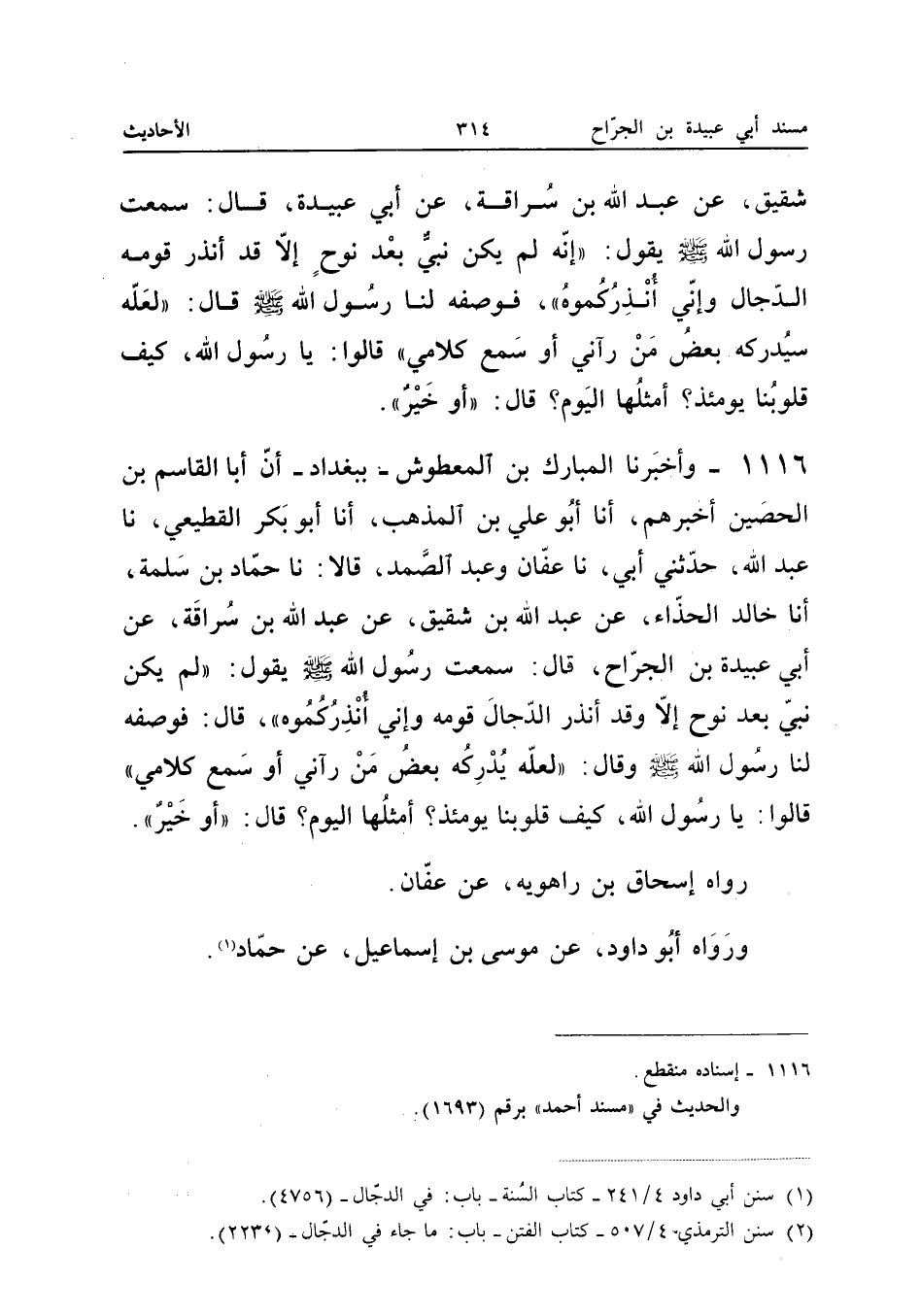 ١١١٦ - وَأَخْبَرَنَا الْمُبَارَكُ بْنُ الْمَعْطُوشِ بِبَغْدَادَ، أَنَّ أَبَا الْقَاسِمِ بْنَ الْحُصَيْنِ أَخْبَرَهُمْ، أَنَا أَبُو عَلِيِّ بْنُ الْمُذْهِبِ، أَنَا أَبُو بَكْرٍ الْقَطِيعِيُّ، نَا عَبْدُ اللهِ، حَدَّثَنِي أَبِي، نَا عَفَّانُ وَعَبْدُ الصَّمَدِ قَالَا: نَا حَمَّادُ بْنُ سَلَمَةَ، أَنَا خَالِدٌ الْحَذَّاءُ، عَنْ عَبْدِ اللهِ بْنِ شَقِيقٍ، عَنْ عَبْدِ اللهِ بْنِ سُرَاقَةَ، عَنْ أَبِي عُبَيْدَةَ بْنِ الْجَرَّاحِ قَالَ: سَمِعْتُ رَسُولَ اللهِ صَلَّى اللهُ عَلَيْهِ وَسَلَّمَ يَقُولُ: «لَمْ يَكُنْ نَبِيٌّ بَعْدَ نُوحٍ إِلَّا وَقَدْ أَنْذَرَ الدَّجَّالَ قَوْمَهُ وَإِنِّي أُنْذِرُكُمُوهُ، قَالَ: فَوَصَفَهُ لَنَا رَسُولُ اللهِ صَلَّى اللهُ عَلَيْهِ وَسَلَّمَ وَقَالَ: لَعَلَّهُ يُدْرِكُهُ بَعْضُ مَنْ رَآنِي أَوْ سَمِعَ كَلَامِي، قَالُوا: يَا رَسُولَ اللهِ، كَيْفَ قُلُوبُنَا يَوْمَئِذٍ؟ أَمِثْلُهَا الْيَوْمَ؟ قَالَ: أَوْ خَيْرٌ.»