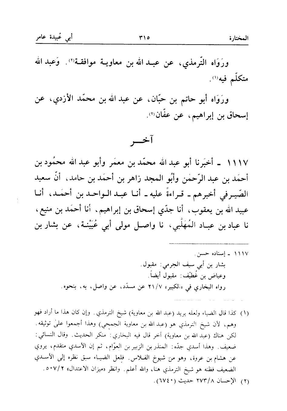 ١١١٧ - أَخْبَرَنَا أَبُو عَبْدِ اللهِ مُحَمَّدُ بْنُ مَعْمَرٍ، وَأَبُو عَبْدِ اللهِ مَحْمُودُ بْنُ أَحْمَدَ بْنِ عَبْدِ الرَّحْمَنِ، وَأَبُو الْمَجْدِ زَاهِرُ بْنُ أَحْمَدَ بْنِ حَامِدٍ، أَنَّ سَعِيدًا الصَّيْرَفِيَّ أَخْبَرَهُمْ قِرَاءَةً عَلَيْهِ، أَنَا عَبْدُ الْوَاحِدِ بْنُ أَحْمَدَ، أَنَا عُبَيْدُ اللهِ بْنُ يَعْقُوبَ، أَنَا جَدِّي إِسْحَاقُ بْنُ إِبْرَاهِيمَ، أَنَا أَحْمَدُ بْنُ مَنِيعٍ، نَا عَبَّادُ بْنُ عَبَّادٍ الْمُهَلَّبِيُّ، نَا وَاصِلٌ مَوْلَى أَبِي عُيَيْنَةَ، عَنْ بَشَّارِ بْنِ