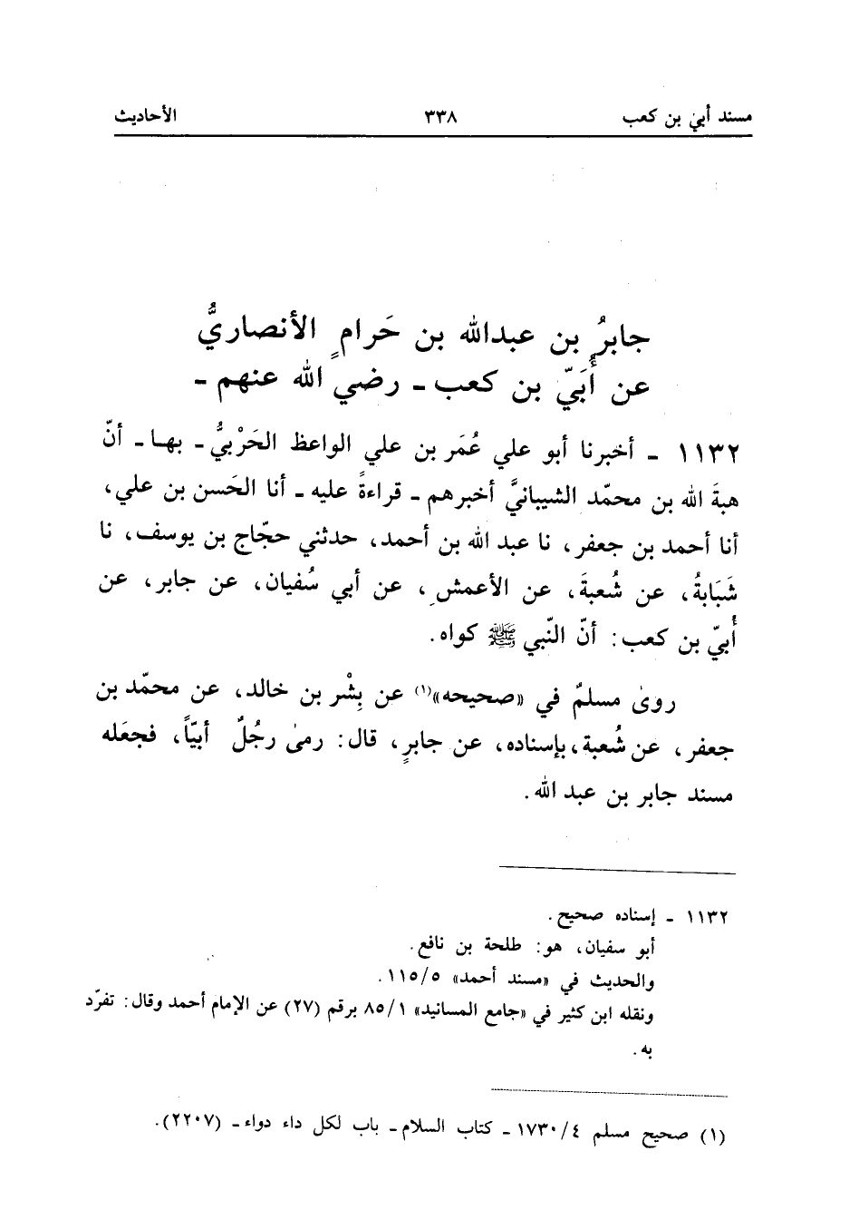 ١١٣٢ - أَخْبَرَنَا أَبُو عَلِيٍّ عُمَرُ بْنُ عَلِيٍّ الْوَاعِظُ الْحَرْبِيُّ بِهَا، أَنَّ هِبَةَ اللهِ بْنَ مُحَمَّدٍ الشَّيْبَانِيَّ أَخْبَرَهُمْ قِرَاءَةً عَلَيْهِ، أَنَا الْحَسَنُ بْنُ عَلِيٍّ، أَنَا أَحْمَدُ بْنُ جَعْفَرٍ، نَا عَبْدُ اللهِ بْنُ أَحْمَدَ، حَدَّثَنِي حَجَّاجُ بْنُ يُوسُفَ، نَا شَبَابَةُ، عَنْ شُعْبَةَ، عَنِ الْأَعْمَشِ، عَنْ أَبِي سُفْيَانَ، عَنْ جَابِرٍ، عَنْ أُبَيِّ بْنِ كَعْبٍ: «أَنَّ النَّبِيَّ صَلَّى اللهُ عَلَيْهِ وَسَلَّمَ كَوَاهُ».