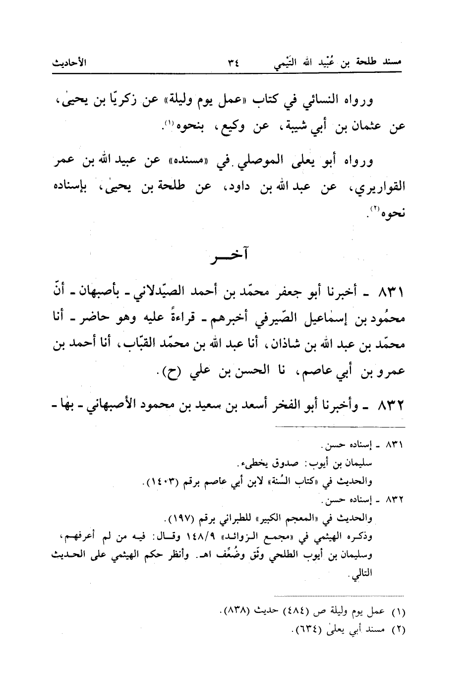٨٣١ - أَخْبَرَنَا أَبُو جَعْفَرٍ مُحَمَّدُ بْنُ أَحْمَدَ الصَّيْدَلَانِيُّ بِأَصْبَهَانَ، أَنَّ مَحْمُودَ بْنَ إِسْمَاعِيلَ الصَّيْرَفِيَّ أَخْبَرَهُمْ قِرَاءَةً عَلَيْهِ وَهُوَ حَاضِرٌ، أَنَا مُحَمَّدُ بْنُ عَبْدِ اللهِ بْنِ شَاذَانَ، أَنَا عَبْدُ اللهِ بْنُ مُحَمَّدٍ الْقَبَّابُ، أَنَا أَحْمَدُ بْنُ عَمْرِو بْنِ أَبِي عَاصِمٍ، نَا الْحَسَنُ بْنُ عَلِيٍّ (ح).