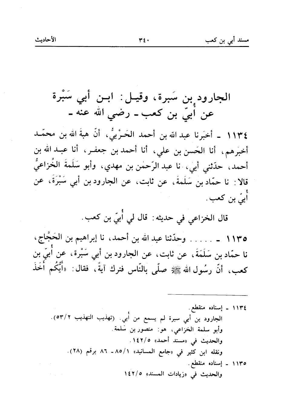 ١١٣٤ - أَخْبَرَنَا عَبْدُ اللهِ بْنُ أَحْمَدَ الْحَرْبِيُّ، أَنَّ هِبَةَ اللهِ بْنَ مُحَمَّدٍ أَخْبَرَهُمْ، أَنَا الْحَسَنُ بْنُ عَلِيٍّ، أَنَا أَحْمَدُ بْنُ جَعْفَرٍ، أَنَا عَبْدُ اللهِ بْنُ أَحْمَدَ، حَدَّثَنِي أَبِي، نَا عَبْدُ الرَّحْمَنِ بْنُ مَهْدِيٍّ، وَأَبُو سَلَمَةَ الْخُزَاعِيُّ قَالَا: نَا حَمَّادُ بْنُ سَلَمَةَ، عَنْ ثَابِتٍ، عَنِ الْجَارُودِ بْنِ أَبِي سَبْرَةَ، عَنْ أُبَيِّ بْنِ كَعْبٍ.