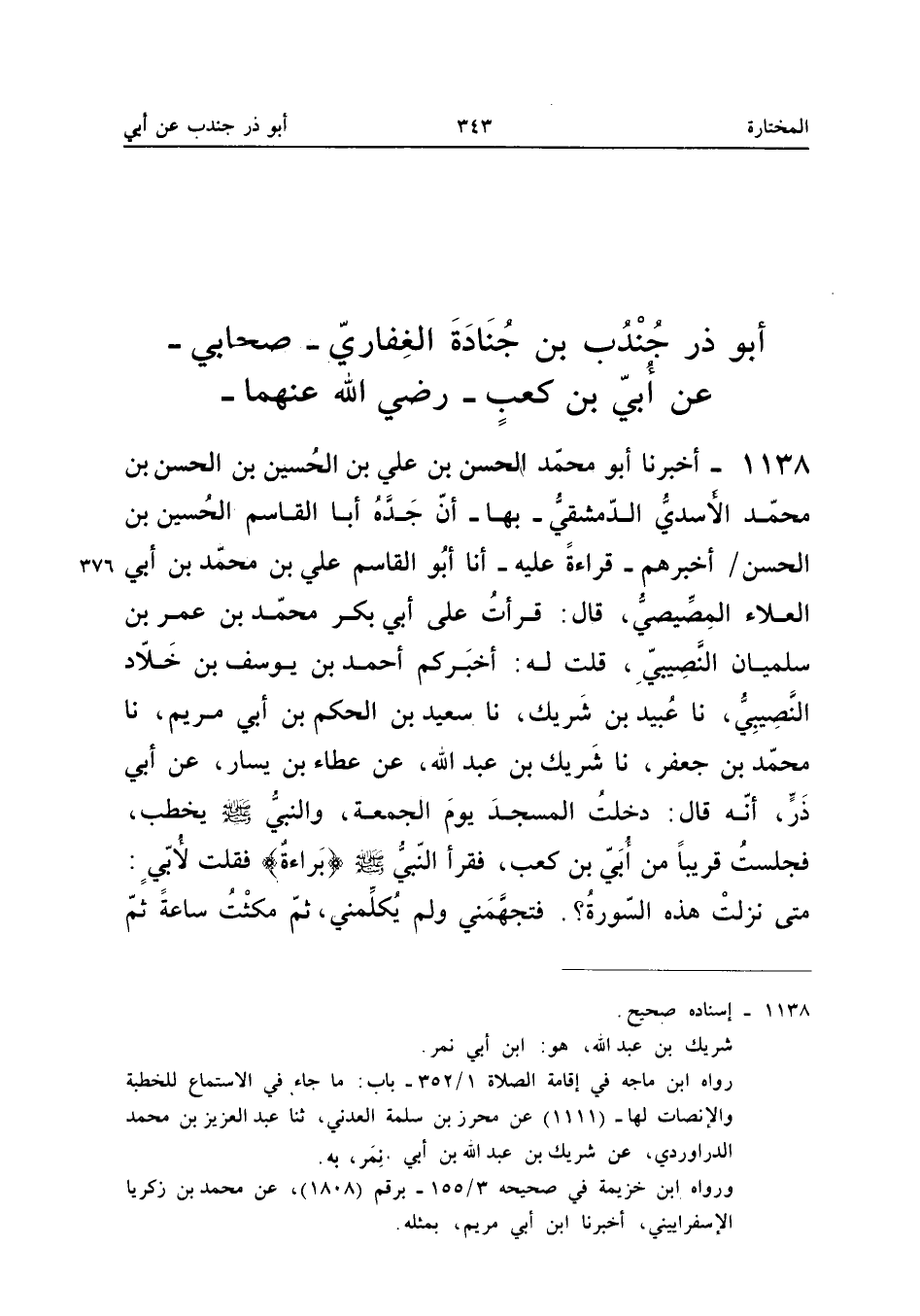 ١١٣٨ - أَخْبَرَنَا أَبُو مُحَمَّدٍ الْحَسَنُ بْنُ عَلِيِّ بْنِ الْحُسَيْنِ بْنِ الْحَسَنِ بْنِ مُحَمَّدٍ الْأَسَدِيُّ الدِّمَشْقِيُّ بِهَا، أَنَّ جَدَّهُ أَبَا الْقَاسِمِ الْحُسَيْنَ بْنَ الْحَسَنِ أَخْبَرَهُمْ قِرَاءَةً عَلَيْهِ، أَنَا أَبُو الْقَاسِمِ عَلِيُّ بْنُ مُحَمَّدِ بْنِ أَبِي الْعَلَاءِ الْمِصِّيصِيُّ قَالَ: قَرَأْتُ عَلَى أَبِي بَكْرٍ مُحَمَّدِ بْنِ عُمَرَ بْنِ سُلَيْمَانَ النَّصِيبِيِّ، قُلْتُ لَهُ: أَخْبَرَكُمْ أَحْمَدُ بْنُ يُوسُفَ بْنِ خَلَّادٍ النَّصِيبِيُّ، نَا عُبَيْدُ بْنُ شَرِيكٍ، نَا سَعِيدُ بْنُ الْحَكَمِ بْنِ أَبِي مَرْيَمَ، نَا مُحَمَّدُ بْنُ جَعْفَرٍ، نَا شَرِيكُ بْنُ عَبْدِ اللهِ، عَنْ عَطَاءِ بْنِ يَسَارٍ، عَنْ أَبِي ذَرٍّ أَنَّهُ قَالَ: «دَخَلْتُ الْمَسْجِدَ يَوْمَ الْجُمُعَةِ وَالنَّبِيُّ صَلَّى اللهُ عَلَيْهِ وَسَلَّمَ يَخْطُبُ، فَجَلَسْتُ قَرِيبًا مِنْ أُبَيِّ بْنِ كَعْبٍ، فَقَرَأَ النَّبِيُّ صَلَّى اللهُ عَلَيْهِ وَسَلَّمَ {بَرَاءَةٌ} فَقُلْتُ لِأُبَيٍّ: مَتَى نَزَلَتْ هَذِهِ السُّورَةُ؟ فَتَجَهَّمَنِي وَلَمْ يُكَلِّمْنِي، ثُمَّ مَكَثْتُ سَاعَةً، ثُمَّ