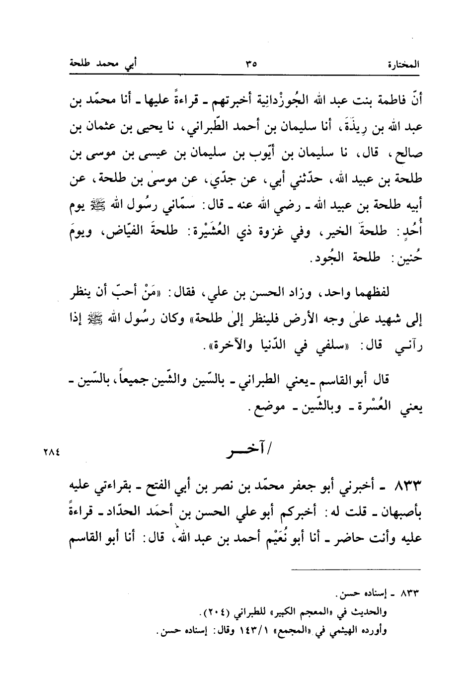 ٨٣٣ - أَخْبَرَنِي أَبُو جَعْفَرٍ مُحَمَّدُ بْنُ نَصْرِ بْنِ أَبِي الْفَتْحِ - بِقِرَاءَتِي عَلَيْهِ بِأَصْبَهَانَ - قُلْتُ لَهُ: أَخْبَرَكُمْ أَبُو عَلِيٍّ الْحَسَنُ بْنُ أَحْمَدَ الْحَدَّادُ قِرَاءَةً عَلَيْهِ وَأَنْتَ حَاضِرٌ، أَنَا أَبُو نُعَيْمٍ أَحْمَدُ بْنُ عَبْدِ اللهِ، قَالَ: أَنَا أَبُو الْقَاسِمِ