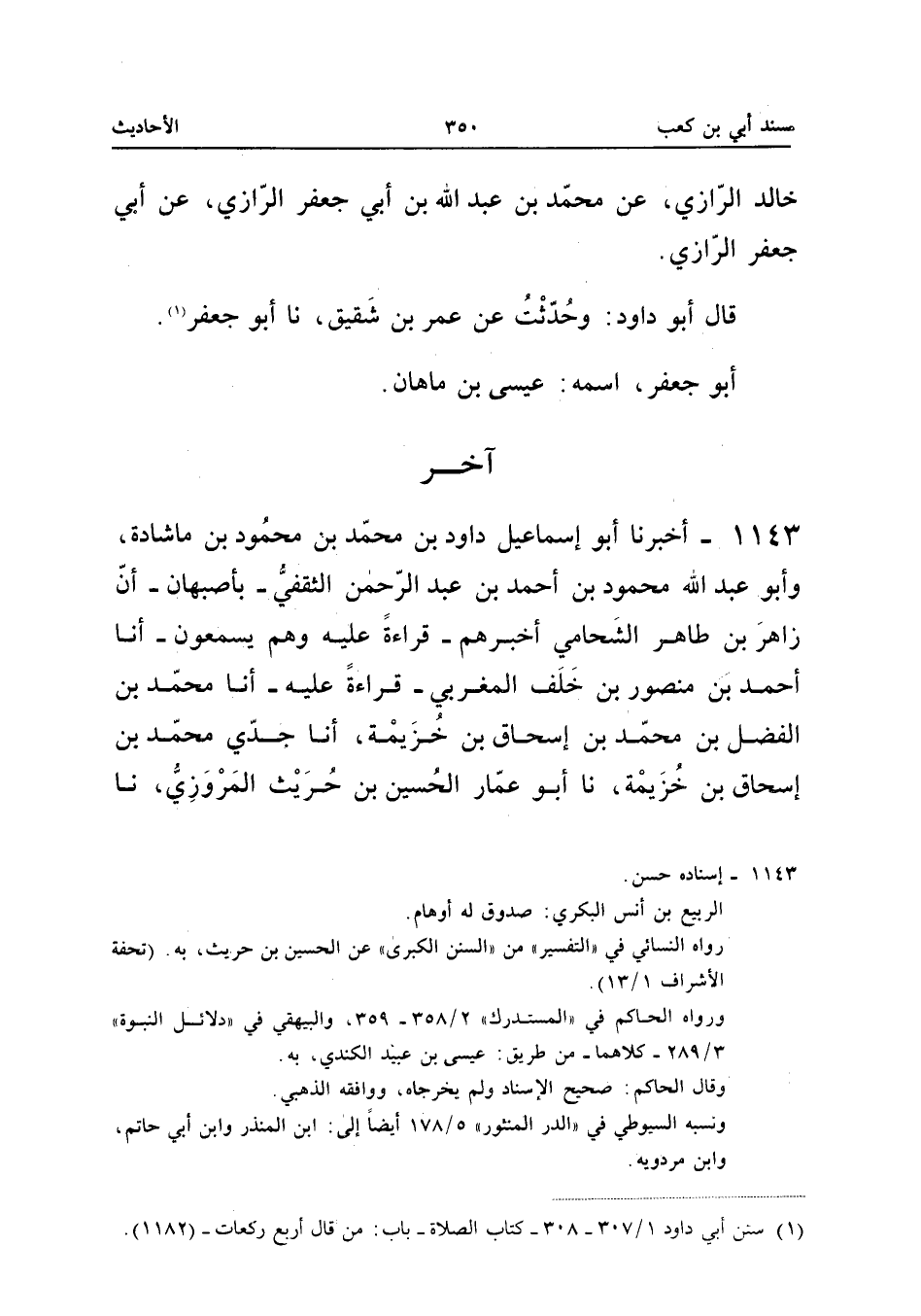 ١١٤٣ - أَخْبَرَنَا أَبُو إِسْمَاعِيلَ دَاوُدُ بْنُ مُحَمَّدِ بْنِ مَحْمُودِ بْنِ مَاشَادَةَ، وَأَبُو عَبْدِ اللهِ مَحْمُودُ بْنُ أَحْمَدَ بْنِ عَبْدِ الرَّحْمَنِ الثَّقَفِيُّ بِأَصْبَهَانَ، أَنَّ زَاهِرَ بْنَ طَاهِرٍ الشَّحَّامِيَّ أَخْبَرَهُمْ قِرَاءَةً عَلَيْهِ وَهُمْ يَسْمَعُونَ، أَنَا أَحْمَدُ بْنُ مَنْصُورِ بْنِ خَلَفٍ الْمَغْرِبِيُّ قِرَاءَةً عَلَيْهِ، أَنَا مُحَمَّدُ بْنُ الْفَضْلِ بْنِ مُحَمَّدِ بْنِ إِسْحَاقَ بْنِ خُزَيْمَةَ، أَنَا جَدِّي مُحَمَّدُ بْنُ إِسْحَاقَ بْنِ خُزَيْمَةَ، نَا أَبُو عَمَّارٍ الْحُسَيْنُ بْنُ حُرَيْثٍ الْمَرْوَزِيُّ، نَا