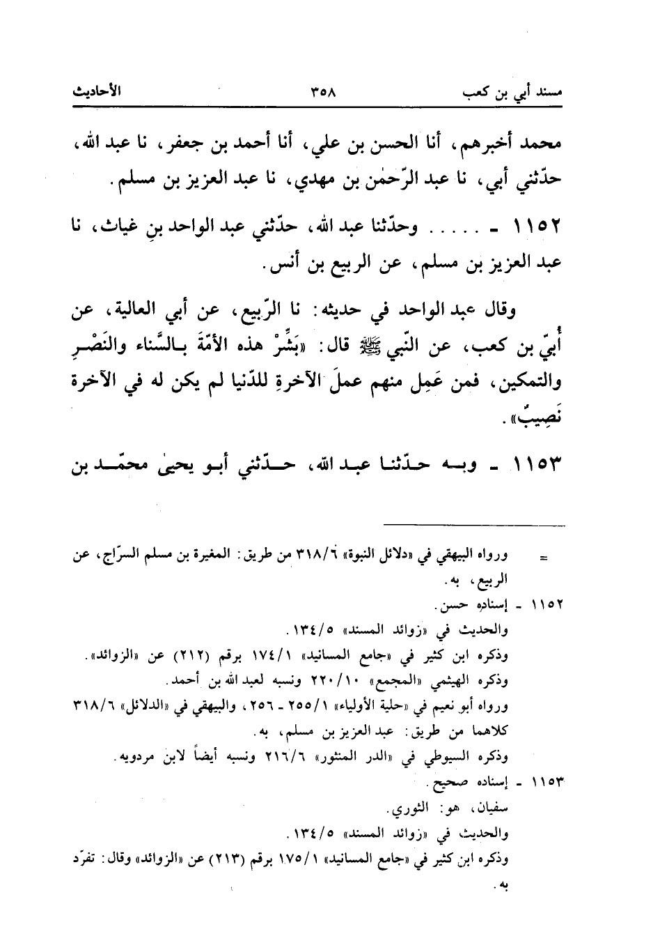 عَبْدِ الرَّحِيمِ الْبَزَّارُ، نَا قَبِيصَةُ، نَا سُفْيَانُ، عَنْ أَيُّوبَ، عَنْ أَبِي الْعَالِيَةِ، عَنْ أُبَيِّ بْنِ كَعْبٍ قَالَ: قَالَ رَسُولُ اللهِ صَلَّى اللهُ عَلَيْهِ وَسَلَّمَ: «بَشِّرْ هَذِهِ الْأُمَّةَ بِالسَّنَاءِ وَالتَّمْكِينِ فِي الْبِلَادِ، وَالنَّصْرِ وَالرِّفْعَةِ فِي الدِّينِ، وَمَنْ عَمِلَ مِنْهُمْ بِعَمَلِ الْآخِرَةِ لِلدُّنْيَا فَلَيْسَ لَهُ فِي الْآخِرَةِ نَصِيبٌ».